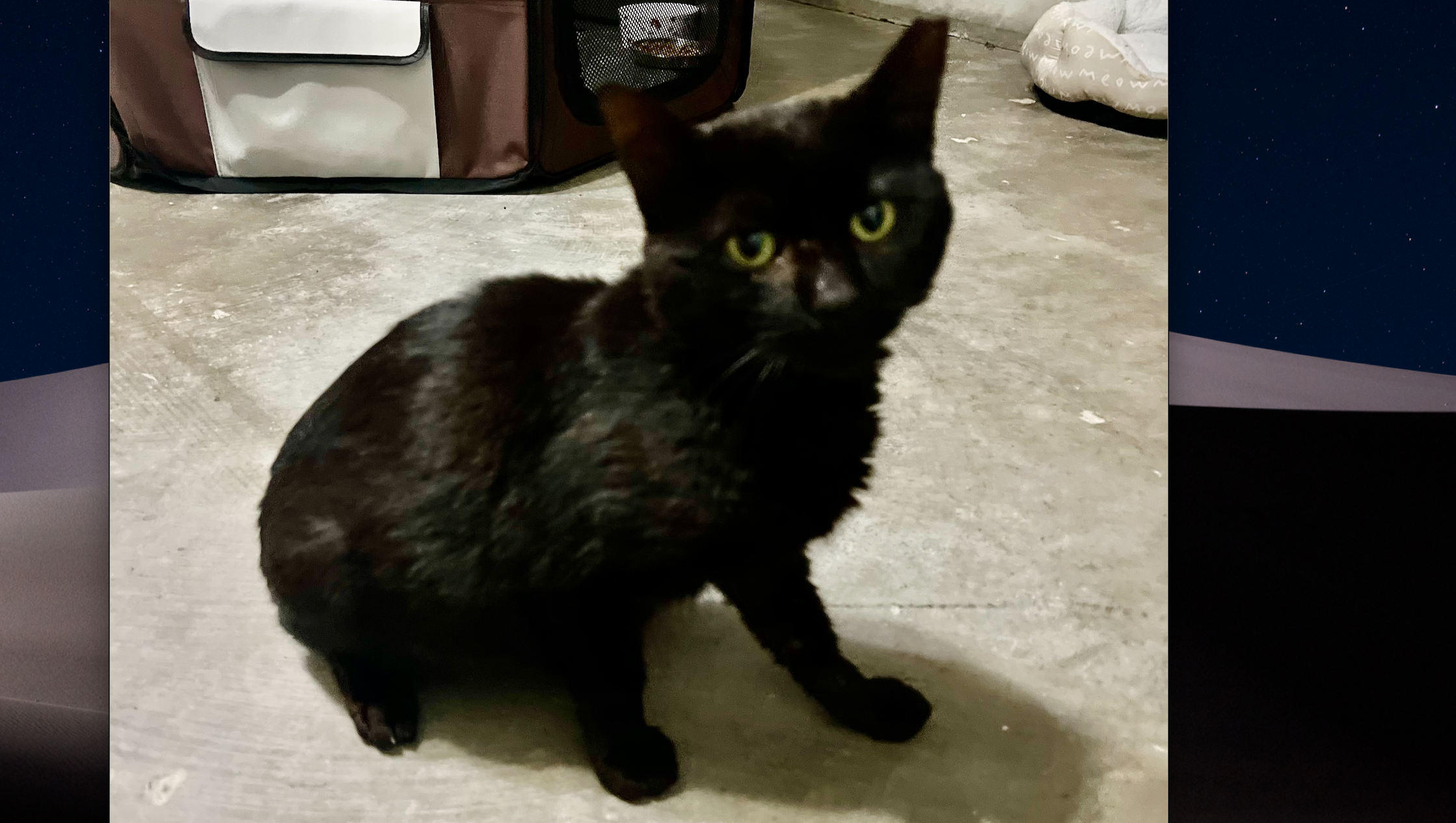 Flow is a 2-3 year old petite 8lb very affectionate, gentle and sweet neutered male black cat with beautiful green eyes. He is so loving and friendly and loves pets and to give headbuts. He was recently taken in for TNVR from one of my colonies where he was recently dumped and was very scared and struggling to acclimate to the colony and street life. During neuter recovery, we realized that he is in fact a very sweet cat who loves human touch.