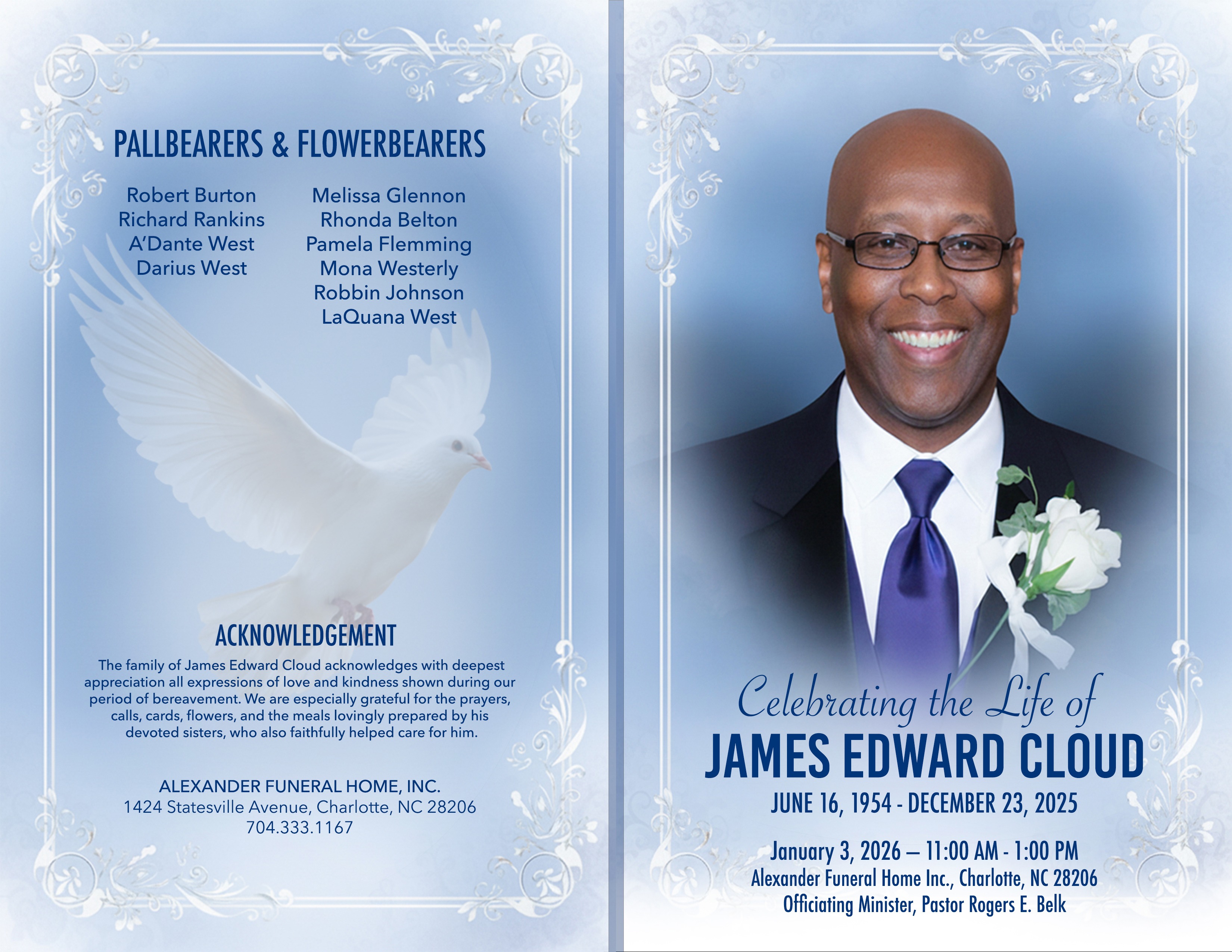James Home going services will be at Alexander Funeral Home on Saturday January 3rd, 2026. 1424 Statesville Ave. Charlotte, NC 28206. 11:00 am Visitation, 12:00-1:00 pm Service.