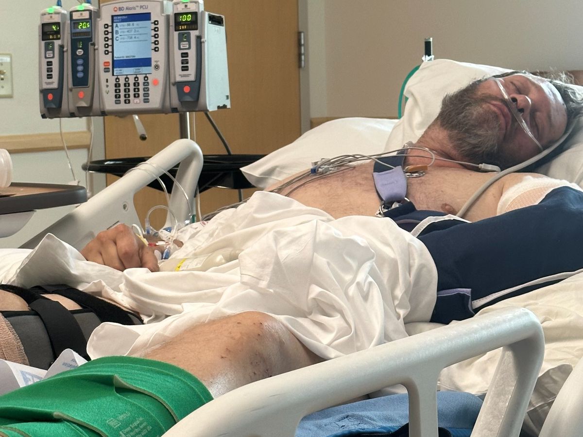 Andy was immediately transported to the Trauma Center at Good Sam Hospital where he spent the next 10 days in ICU. He broke 14 bones - his right leg, ankle, his pelvic bone on the left side, sacrum, his arm (an open fracture that exposed his bone) - and when she first saw him, Jen picked shattered glass from his head and mouth.