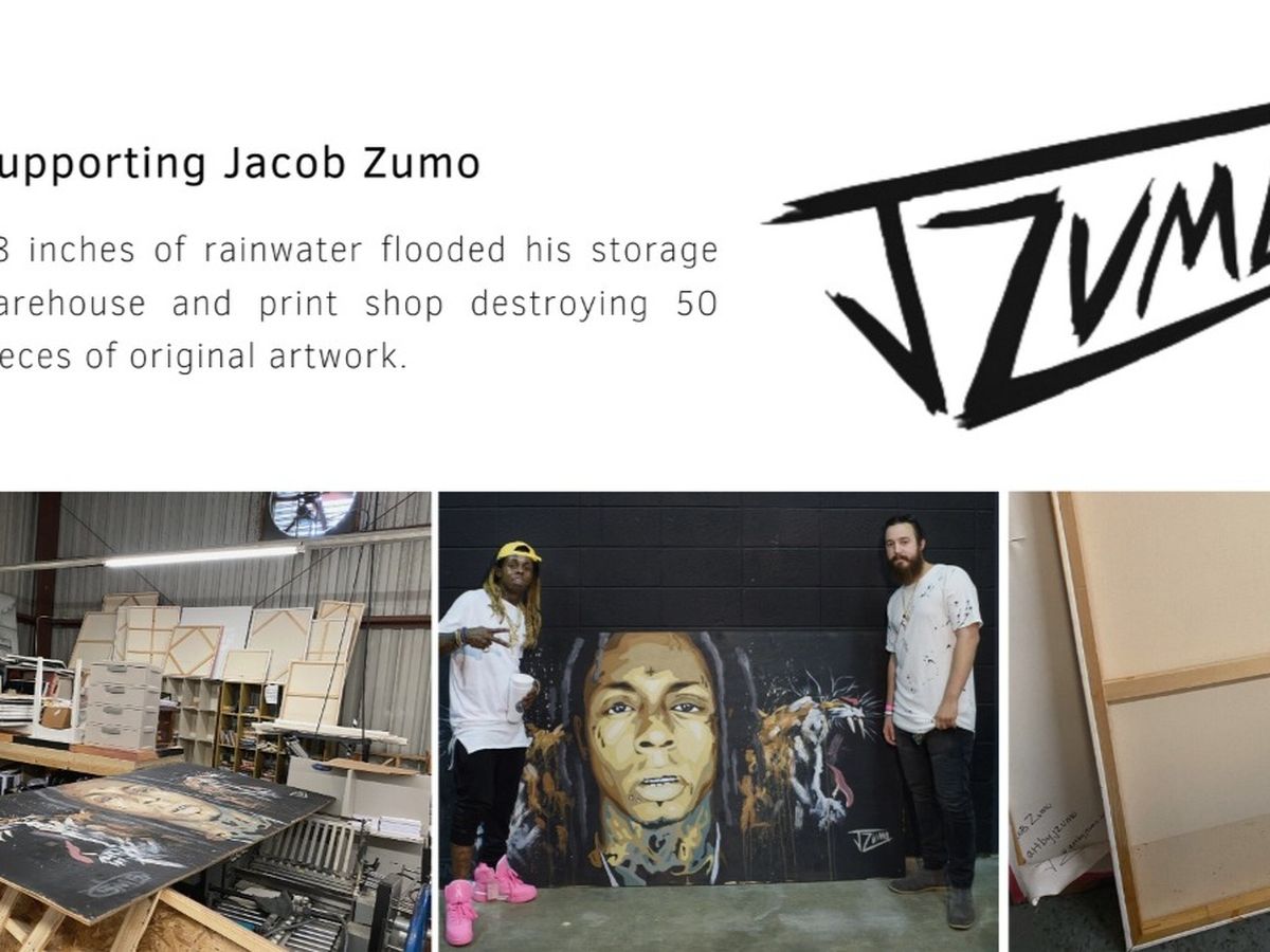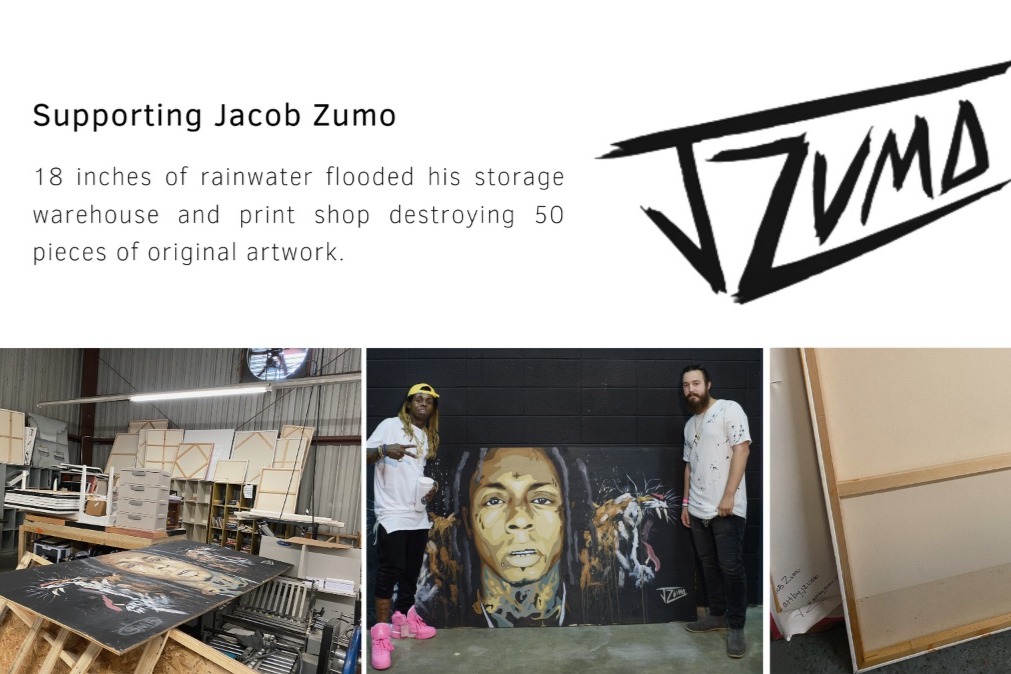 This week, a massive thunderstorm passed over much of the south. During the storm, Jacob's storage warehouse and printshop, housing over $100,000 in inventory and materials, flooded. More than 18 inches of rainwater filled the space leaving behind stained canvases, warped wood, and soaking wet works on paper. While he's attempting to salvage what he can, most of these original pieces are totally destroyed.