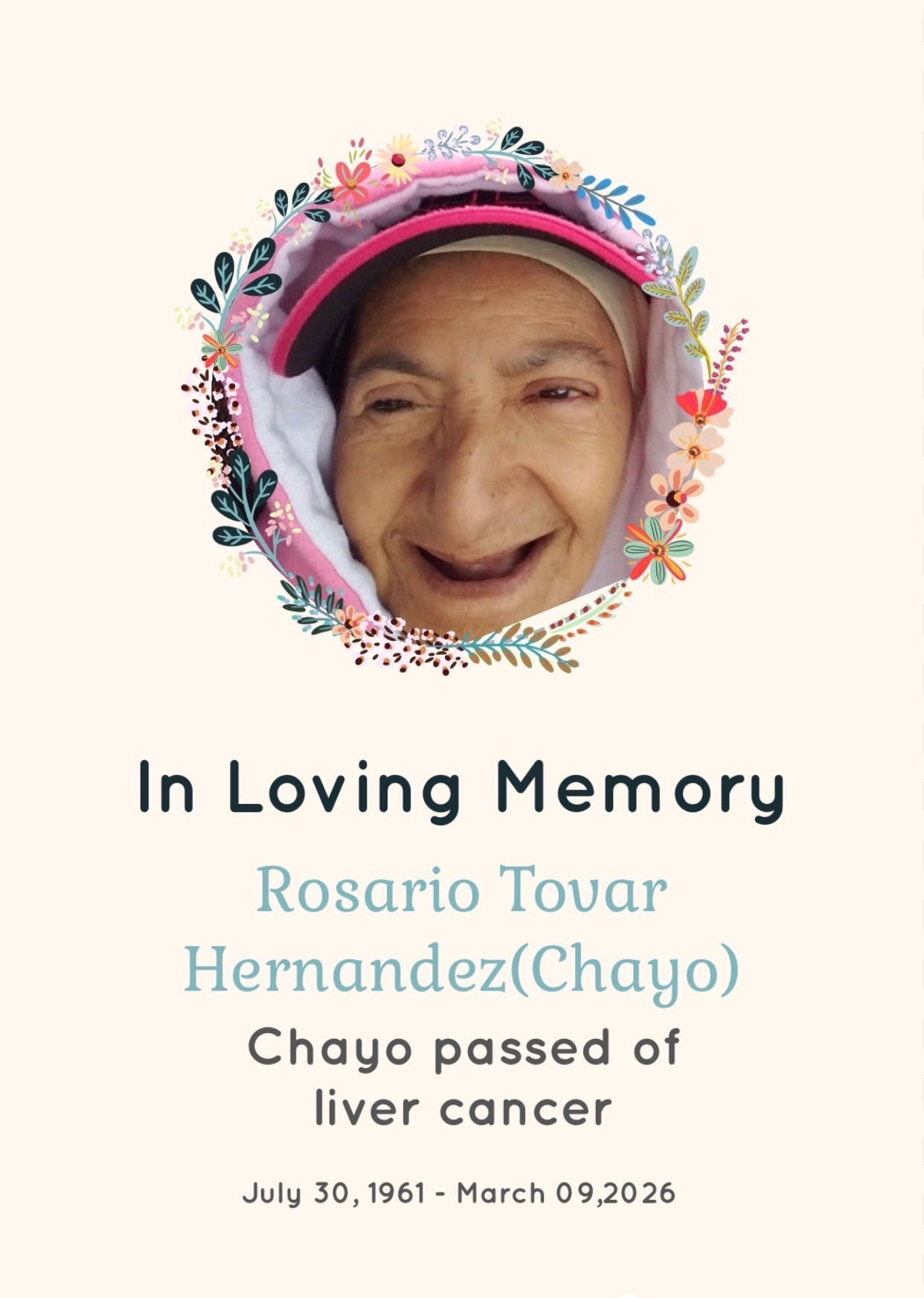 We are heartbroken by the loss of our aunt after her courageous battle with liver cancer. She was a beloved member of our family, always offering warmth, wisdom, and support to those around her. Her strength and kindness touched everyone who knew her, and her absence leaves a deep void in our lives.