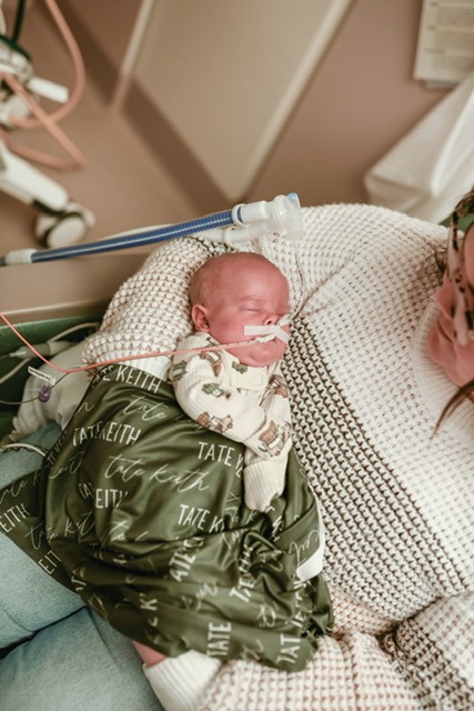 Since his birth, Tate has been in the NICU where he continues to grow stronger each day. Over the past several months, he has faced challenges that most of us could never imagine. He has undergone surgery, relied on specialized machines and respiratory support, and continues to work hard as his lungs develop. He is currently on ECMO following surgery, which is helping give his heart and lungs time to rest and recover. Even through such serious hurdles, Tate continues to show just how strong and resilient he is, truly a tiny but mighty fighter.