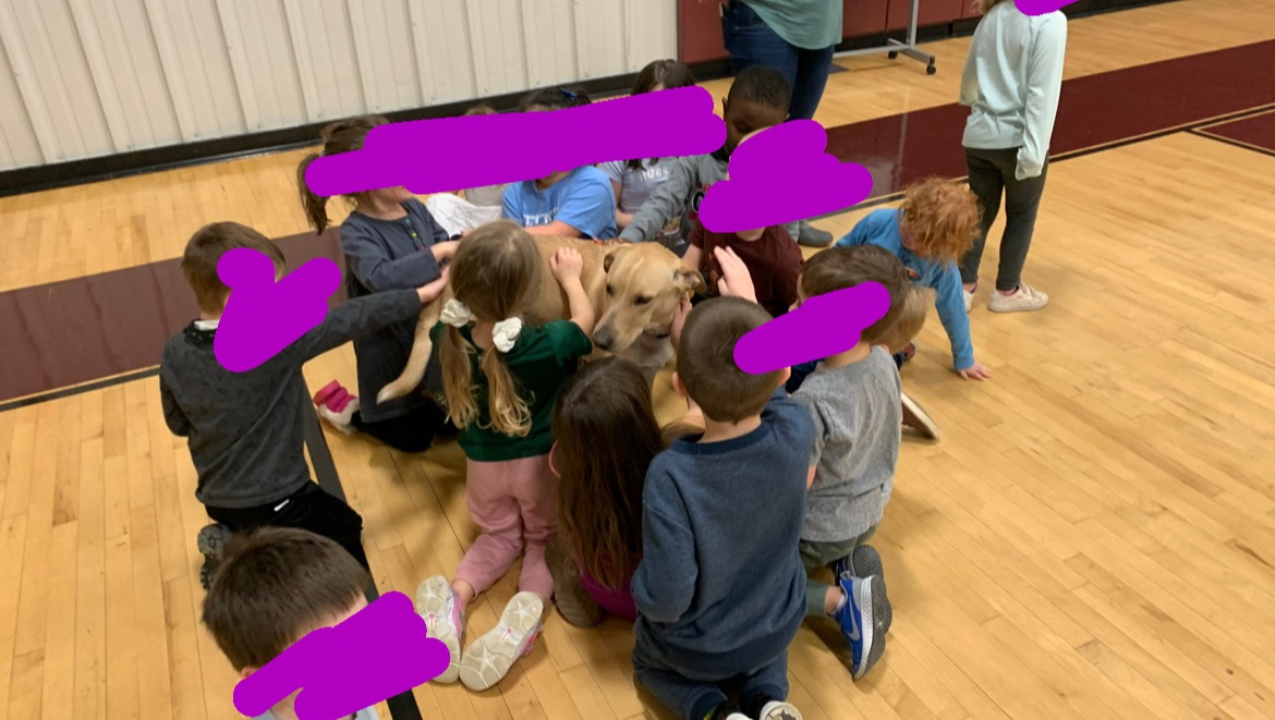 Barkley is very special to our school and is the highlight of every teacher and students' day. Barkley goes outside for arrival every morning to greet students as they come to school, as well as saying good-bye everyday at dismissal. Barkley's mom is our P.E. teacher, so Barkley also enjoys participating with the students in P.E. each day. Having this injury has made it a little more difficult for Barkley to do all of his favorite things at school.