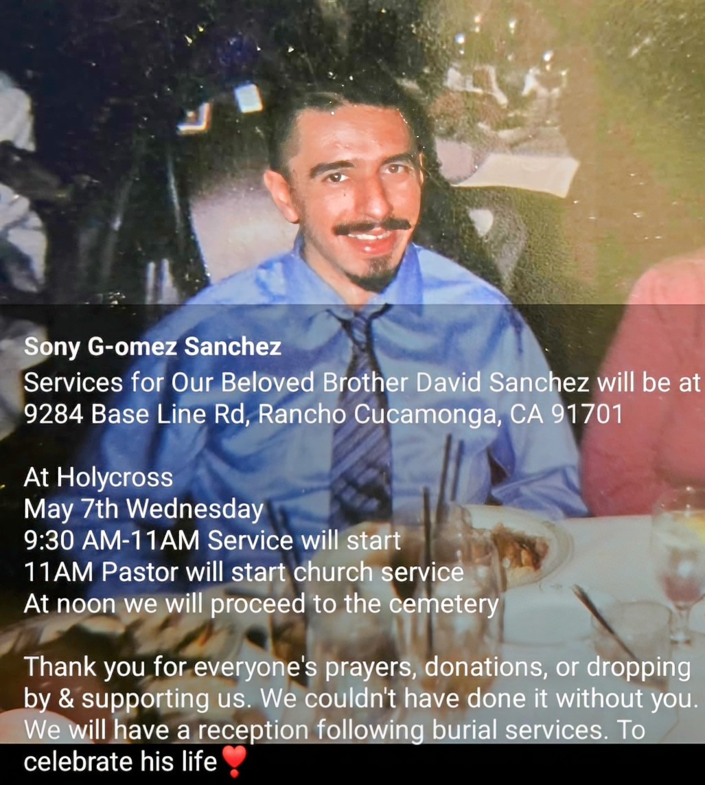 Please continue to pray for David & the Sanchez family at this moment. Thank you, any amount of donation is greatly appreciated to help lay him to rest.