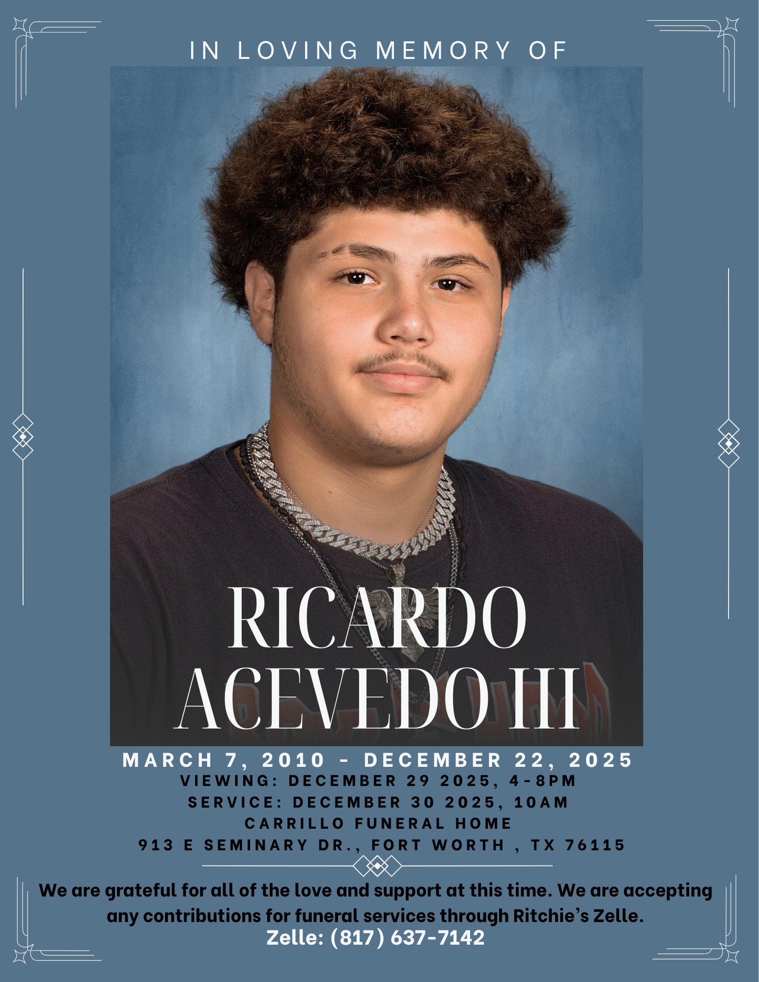 On 12/22/25, my cousin Heather experienced the unimaginable loss of her 15-year-old son. He was a loving, sweet child who deeply cherished time with his family and friends. He had a passion for making music and enjoyed being involved in sports. He dreamed of graduating early and going into a trade, all while continuing to pursue his music career. His kindness, creativity, and big heart touched everyone who knew him.