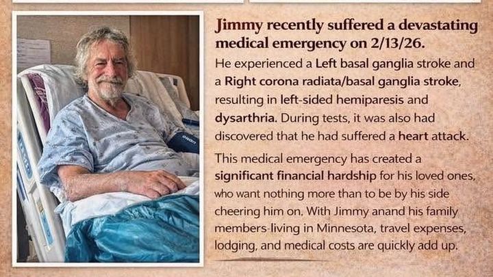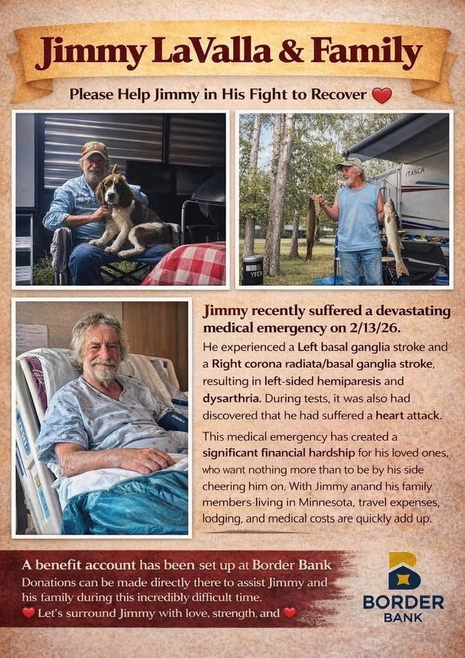 We are reaching out today with heavy hearts and an urgent request for help for Jimmy LaValla and our family. On February 13, 2026, Jimmy suffered a devastating medical emergency—two rare strokes and a heart attack—that changed everything in an instant. The strokes have left him with left-sided weakness and difficulty speaking, swallowing, and walking. He was life-flighted from Roseau, MN to Sanford in Fargo, ND, where he spent a week in the hospital before being transferred for intensive physical therapy and rehab. He will remain there until he is strong enough to return home.