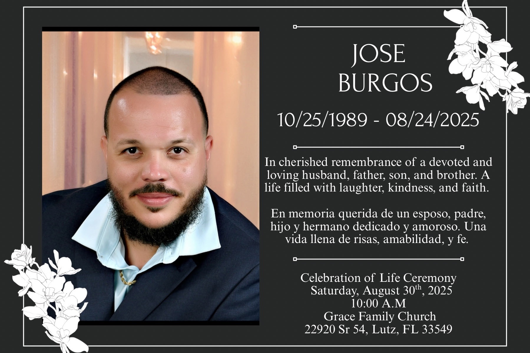 Jose Burgos was a beloved father, son, neighbor, and God follower, known for his kindness and willingness to help anyone in need. His sudden passing in a tragic accident on I-75 and Gibsonton, FL, has left his young family facing an unimaginable loss. Jose’s great disposition and humor touched everyone around him, and his absence is deeply felt by all who knew him.
