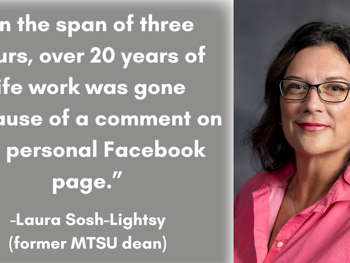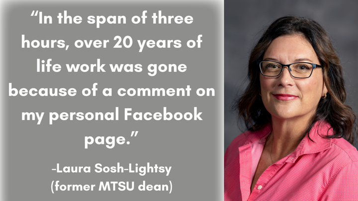 On September 10, 2025, Laura Sosh-Lightsy was abruptly fired from her position at Middle Tennessee State University (MTSU) following personal Facebook posts expressing her opinion about a public figure. Laura served as the Associate Dean of Student Care and Conduct and was employed by MTSU for 21 years. Regardless of where anyone stands politically, this situation has raised deep concerns about free expression and fairness in the workplace.