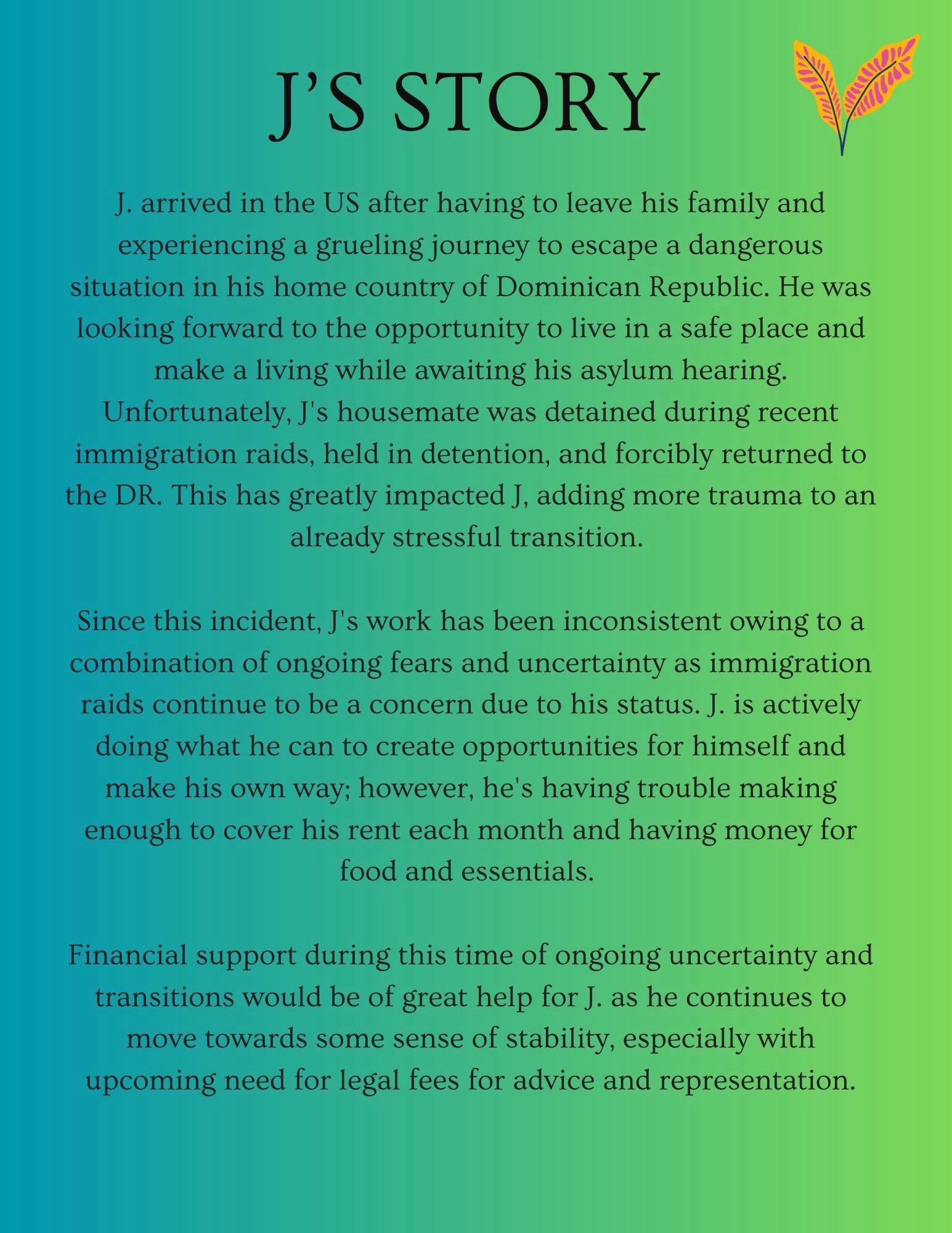 Since this incident, J's work has been inconsistent owing to a combination of ongoing fears and uncertainty as immigration raids continue to be a concern due to his status. J. is actively doing what he can to create opportunities for himself and make his own way; however, he's having trouble making enough to cover his rent each month and having money for food and essentials.