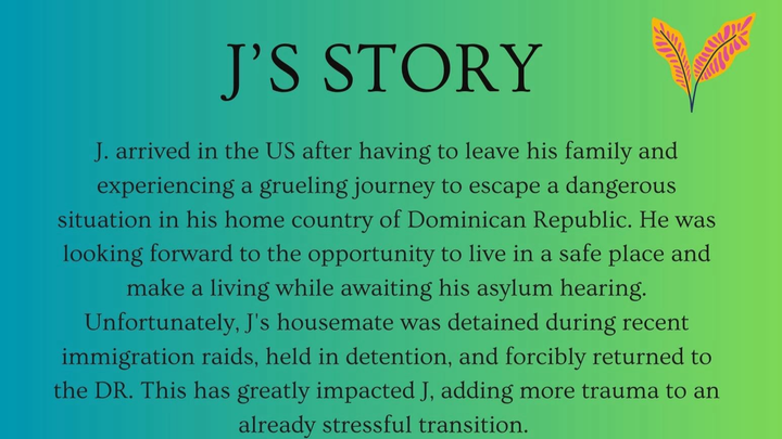 Unfortunately, J's housemate was detained during recent immigration raids, held in detention, and forcibly returned to the DR. This has greatly impacted J, adding more trauma to an already stressful transition.