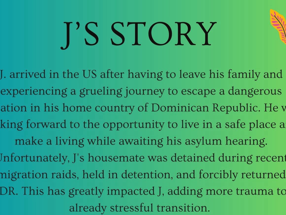 J. arrived in the US after having to leave his family and experiencing a grueling journey to escape a dangerous situation in his home country of Dominican Republic. He was looking forward to the opportunity to live in a safe place and make a living while awaiting his asylum hearing.