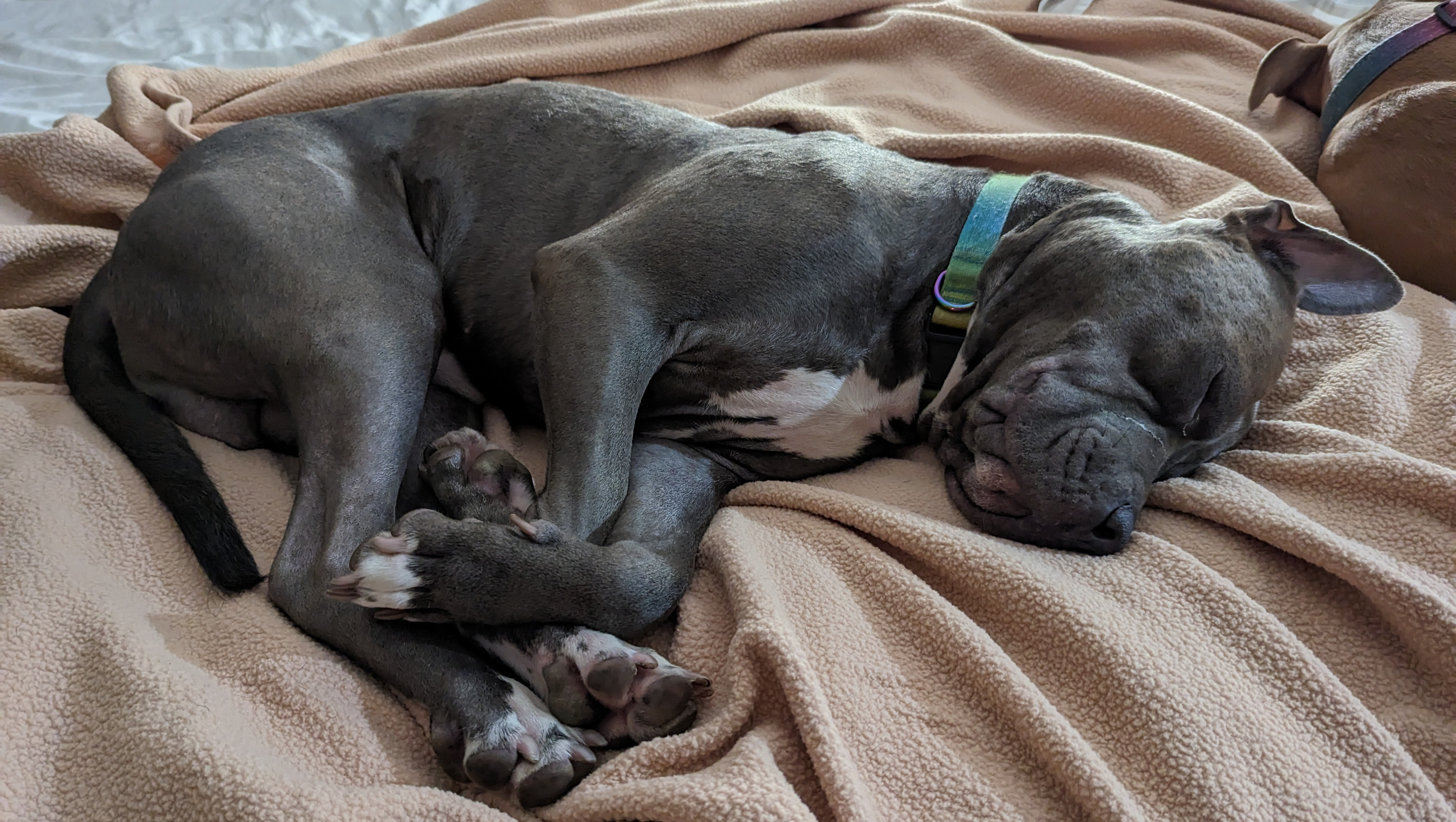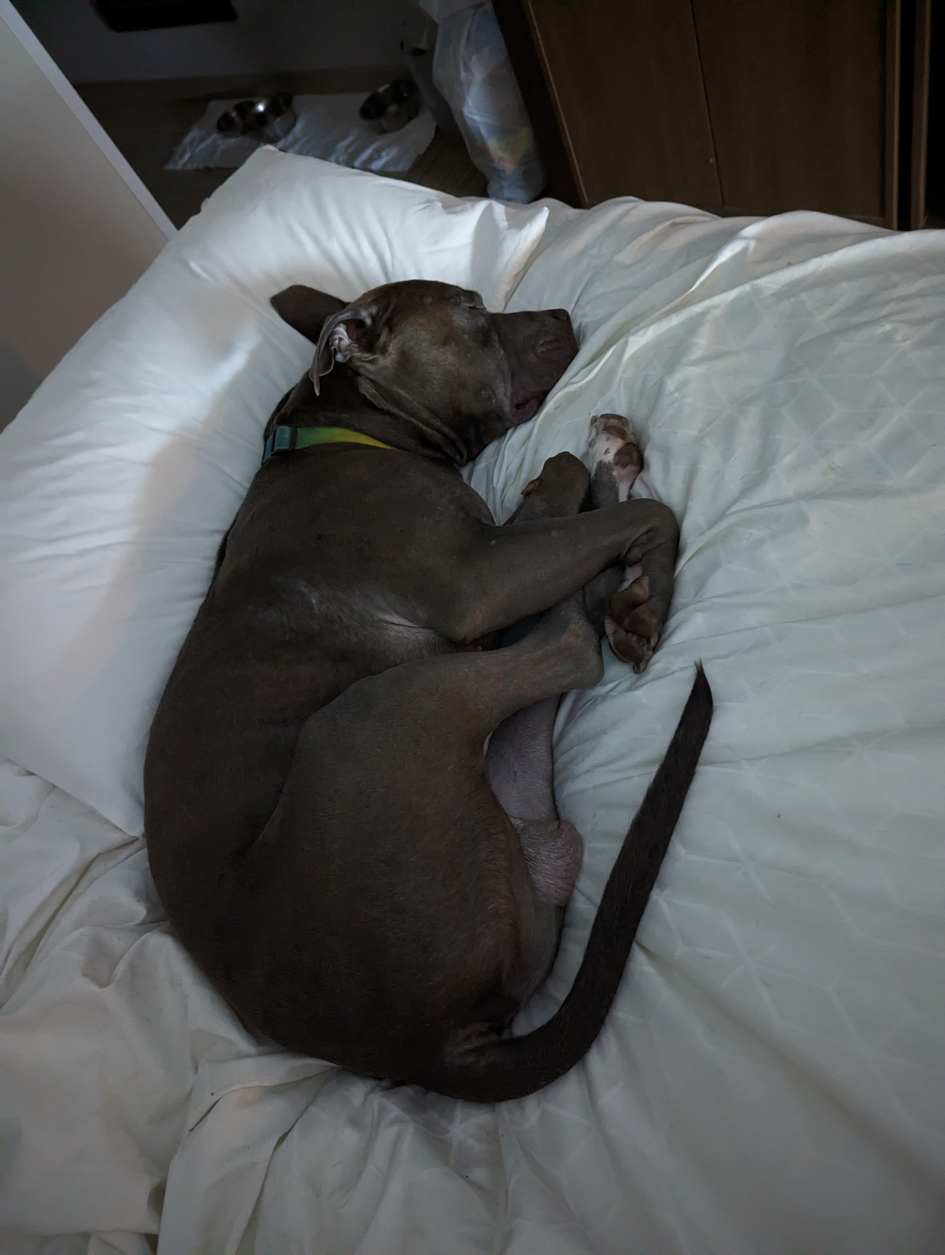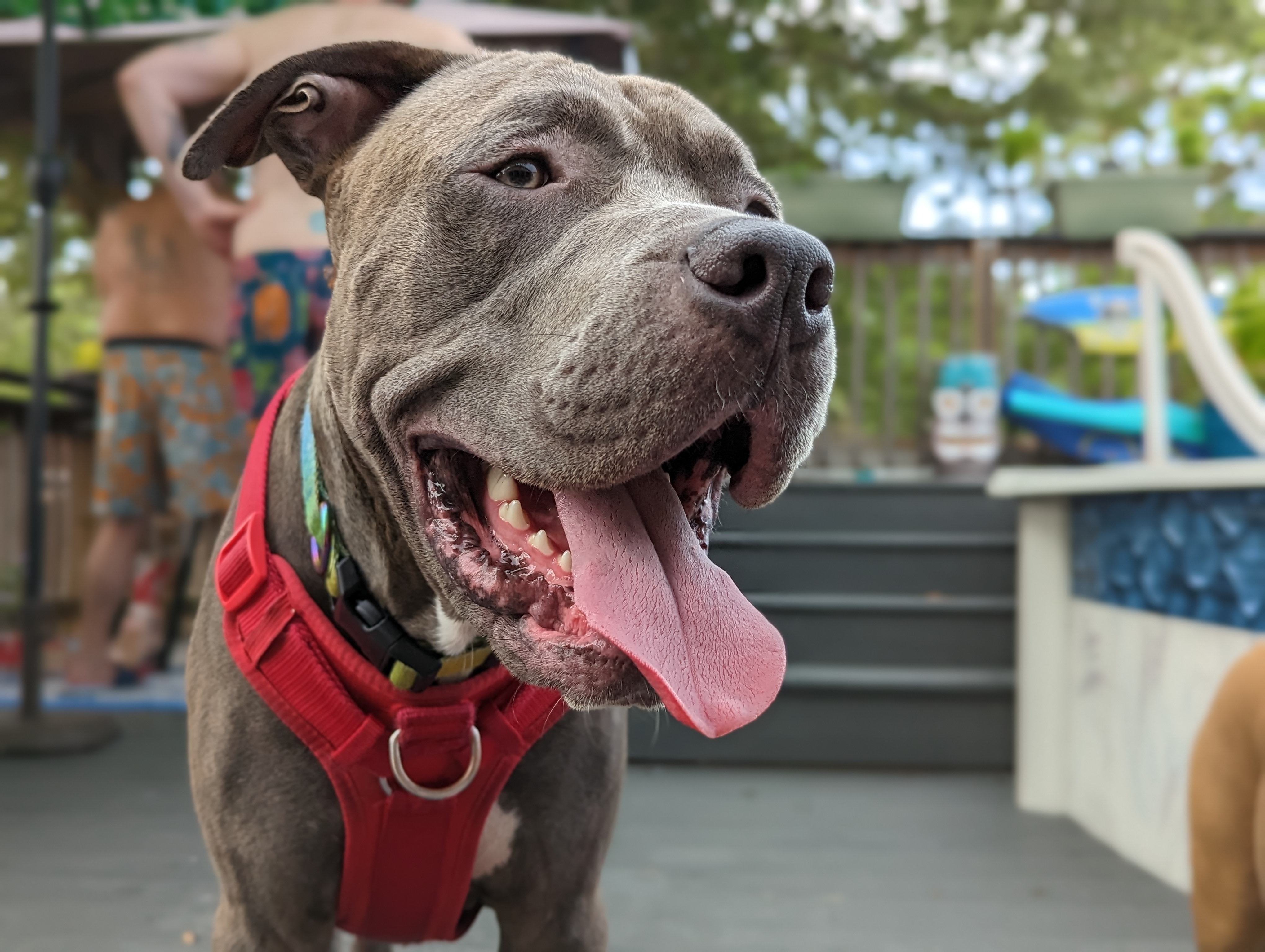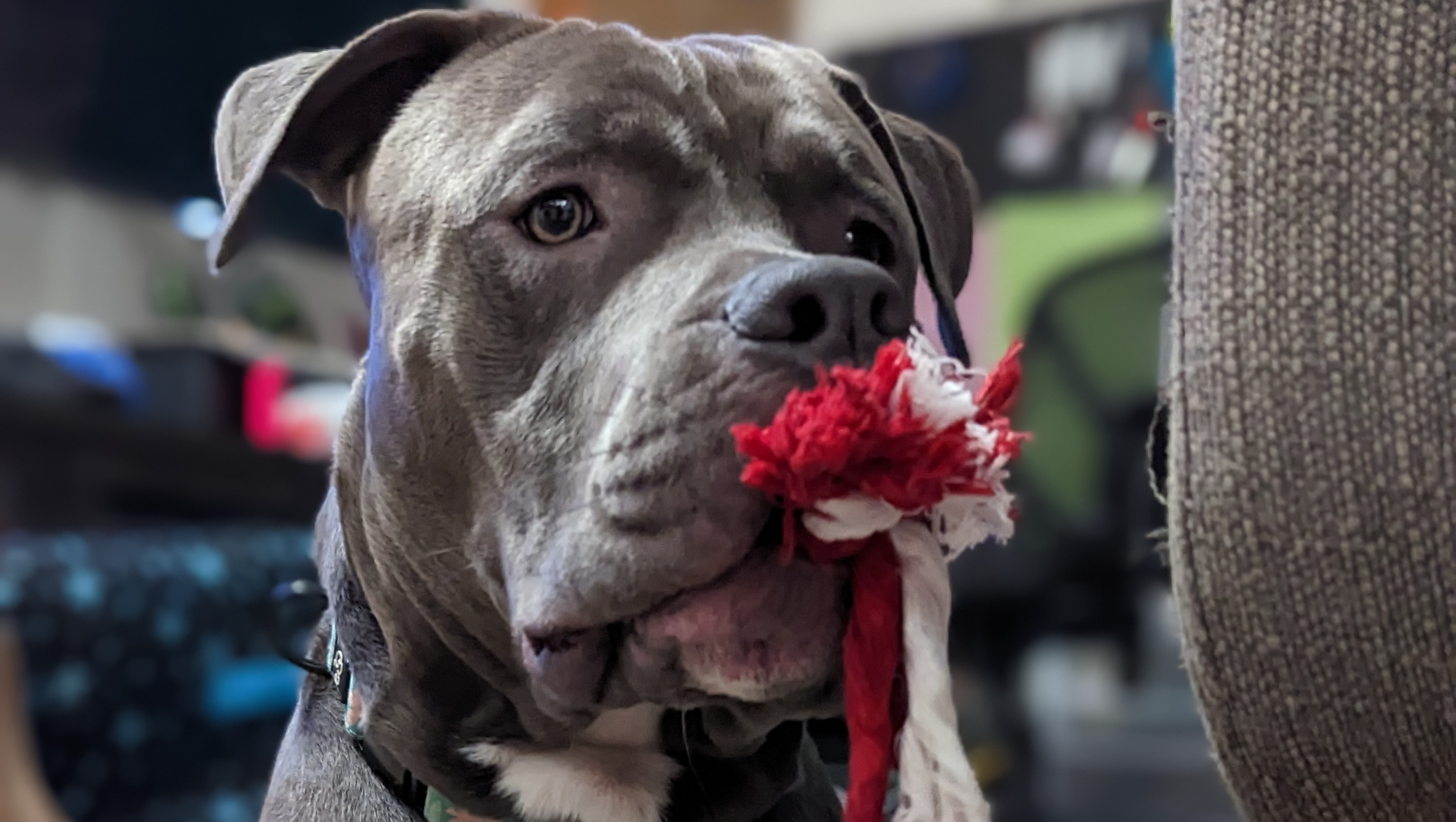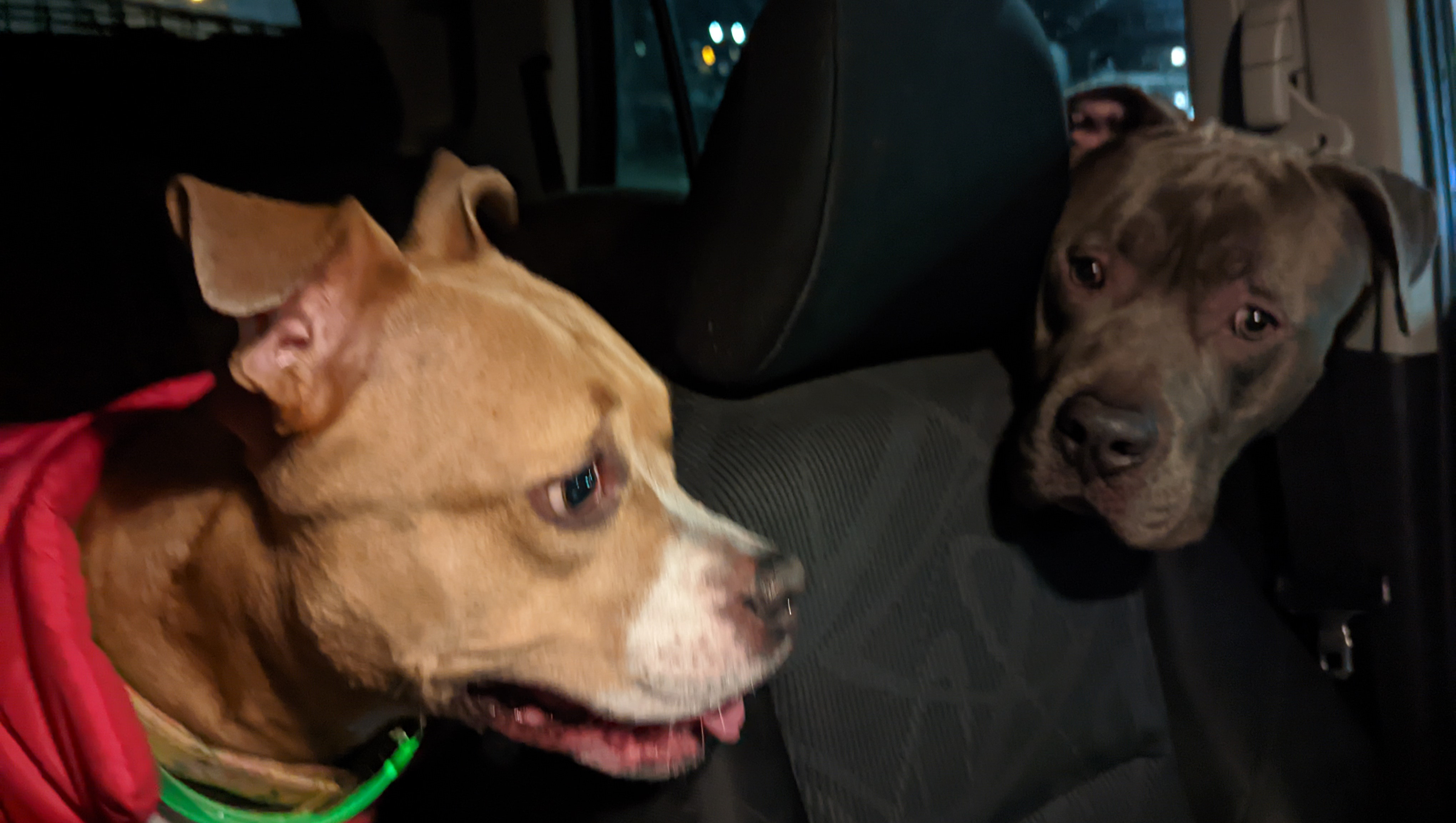 Lui came into our lives in December of 2022 at barely a year old, while we still lived in Seattle. Our neighbor knew we had one pittie already, and asked if we wanted another one. He explained that his cousin had been neglecting his dog, and abandoning the dog with his parents for weeks at a time. The parents were responsible for the dog and couldn't care for him, and were about to surrender him to a shelter in hopes that he could end up somewhere better. Reaching out to us was a last resort before surrendering him. We had wanted to adopt a sibling for our other dog, Zubeia, so we decided to take her to meet Lui and see if they got along.