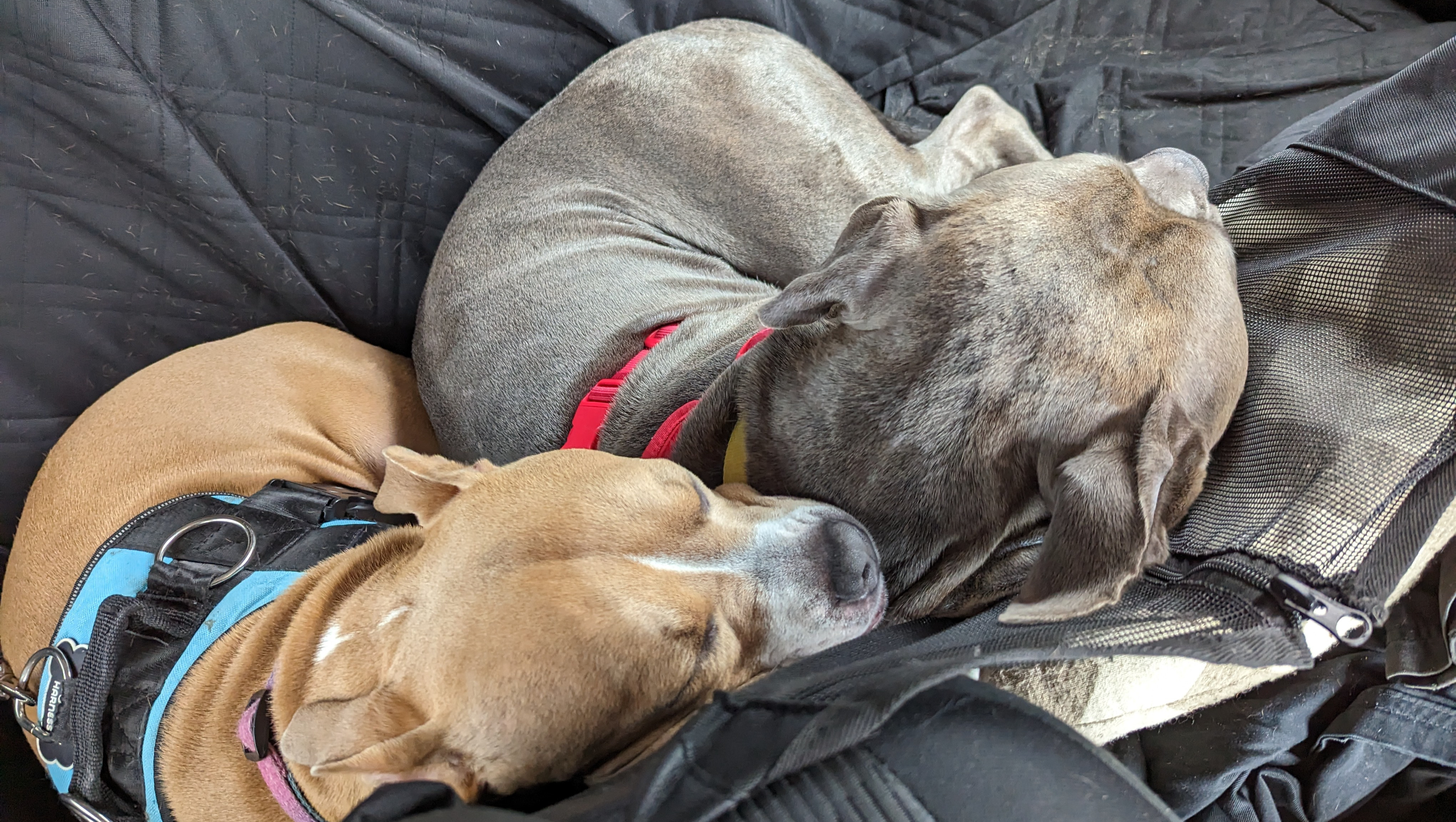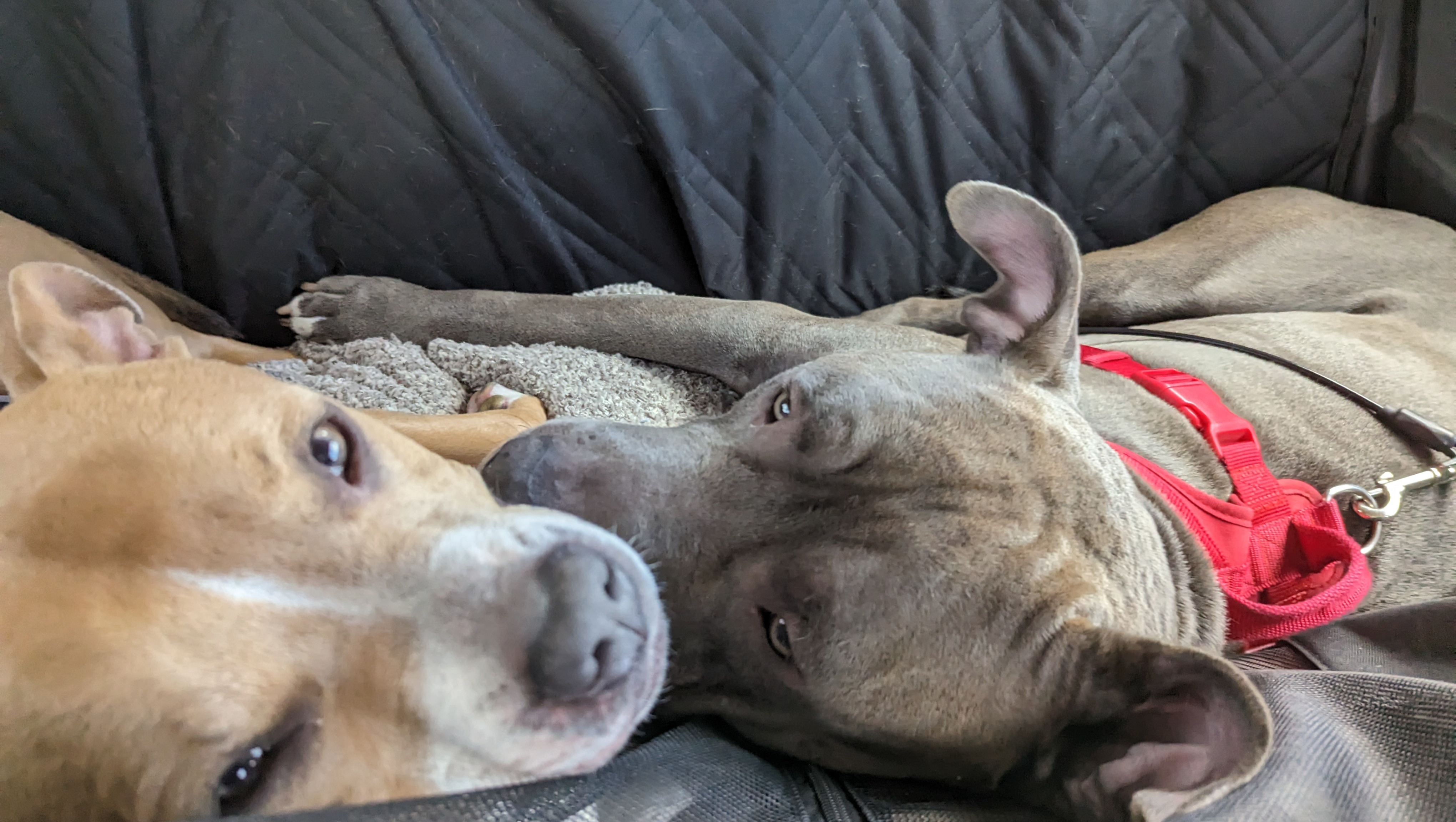 We arrived at the house and were welcomed inside. As soon as Zubi and Lui saw each other, they took off running! Lui grabbed his only toy and showed it to Zubi, goading her into chasing him. She quickly obliged and the two disappeared upstairs. We all laughed together in the kitchen. Our biggest potential hurdle to helping Lui was whether or not he and Zubi got along, and in seconds, they were already best friends. They spent the rest of the visit chasing each other and playing. Lui put up with Zubi's tendency to bark incessantly as she played, which usually annoyed other dogs. And being bigger than her, he could easily handle her pittie wrestles and rough play. They were the perfect siblings. We left shortly after with Lui, his crate, his blankie, and his only chew toy, and welcomed him to his new home and family.