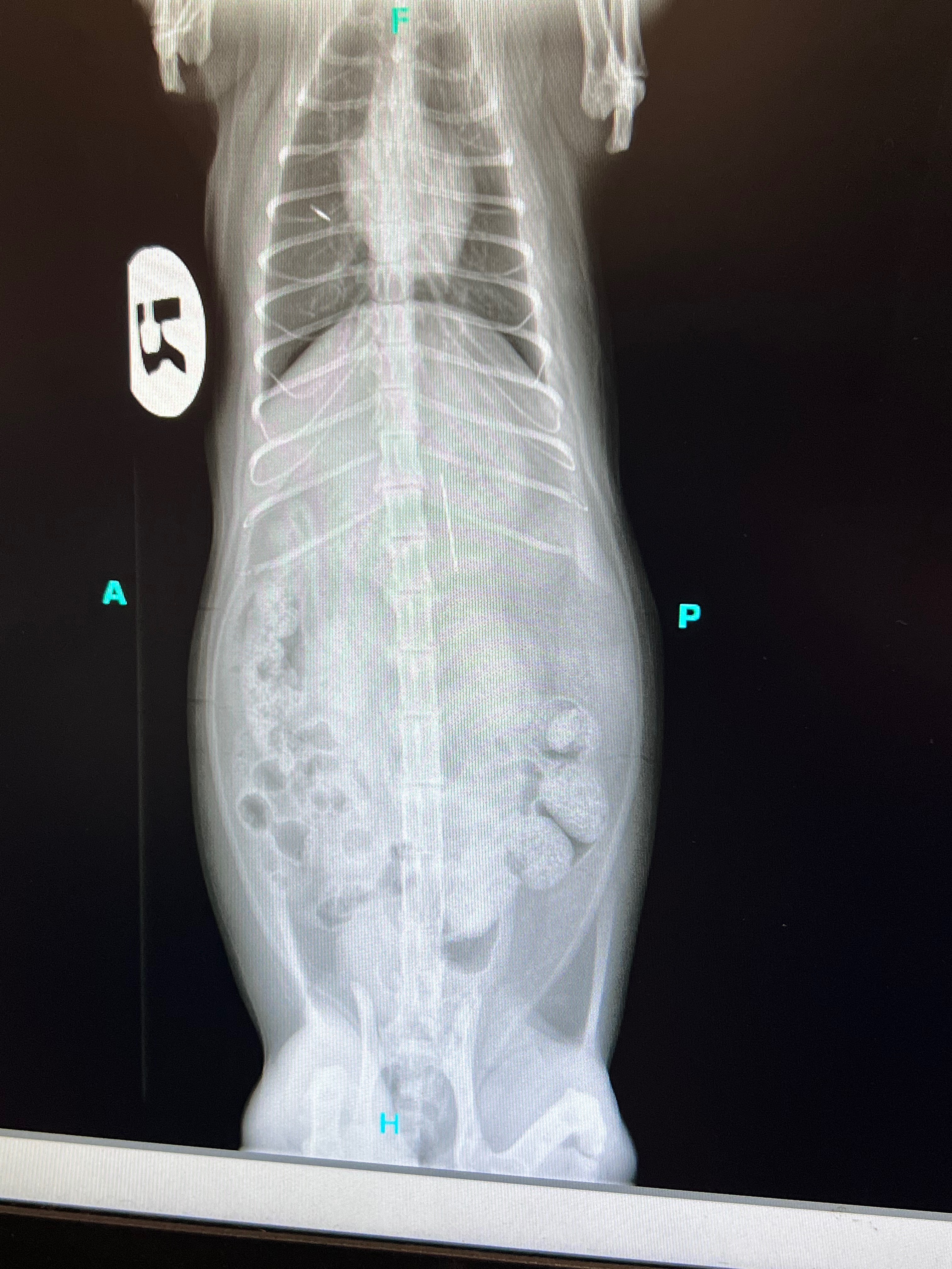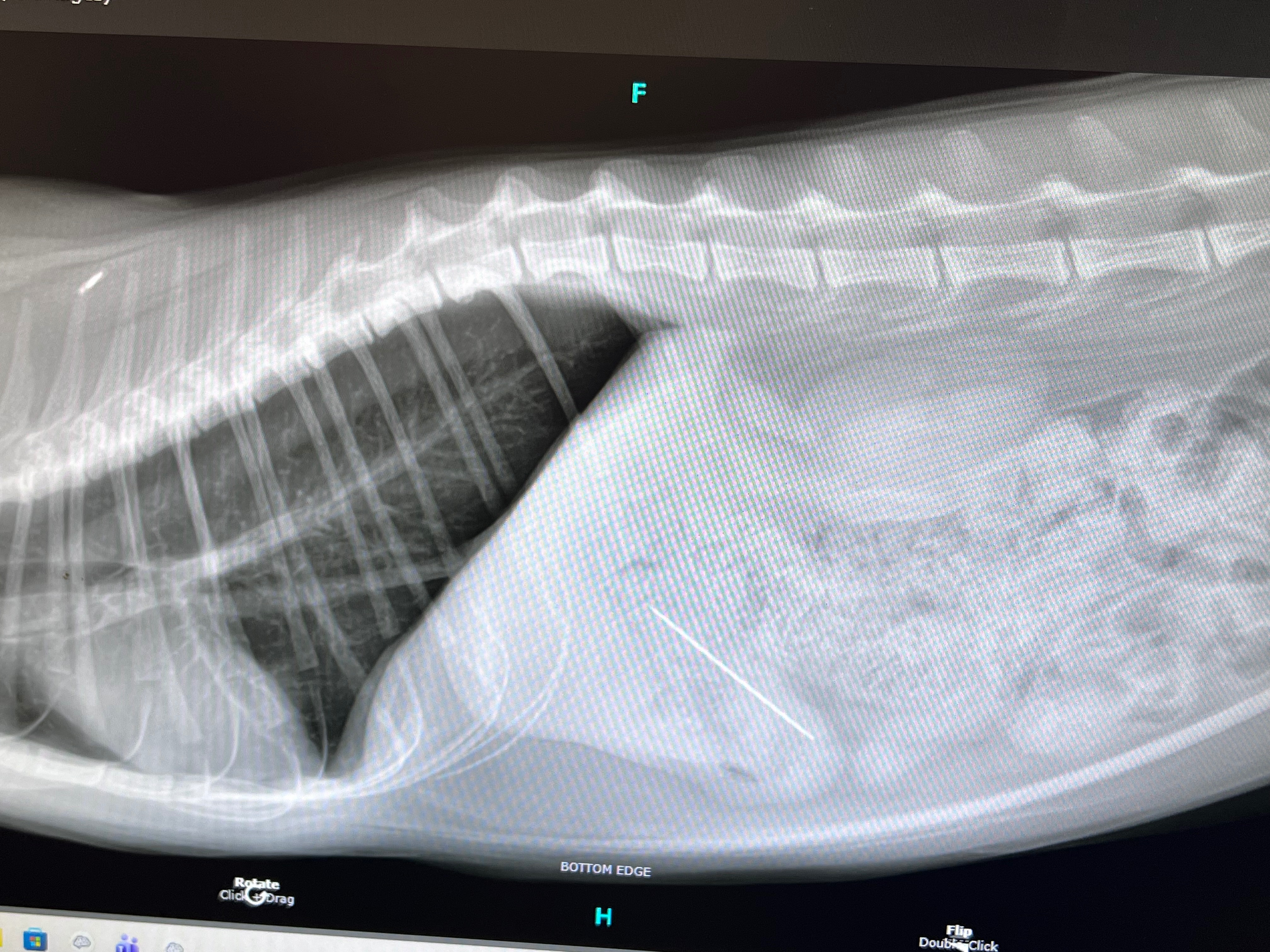 We called the nearest emergency vet in advance and were quoted with a $215 initial examination fee, we drove over and checked in. She needed to get X-rays done which were $346.50, the X-rays showed the needle was lodged at the entrance of her stomach.