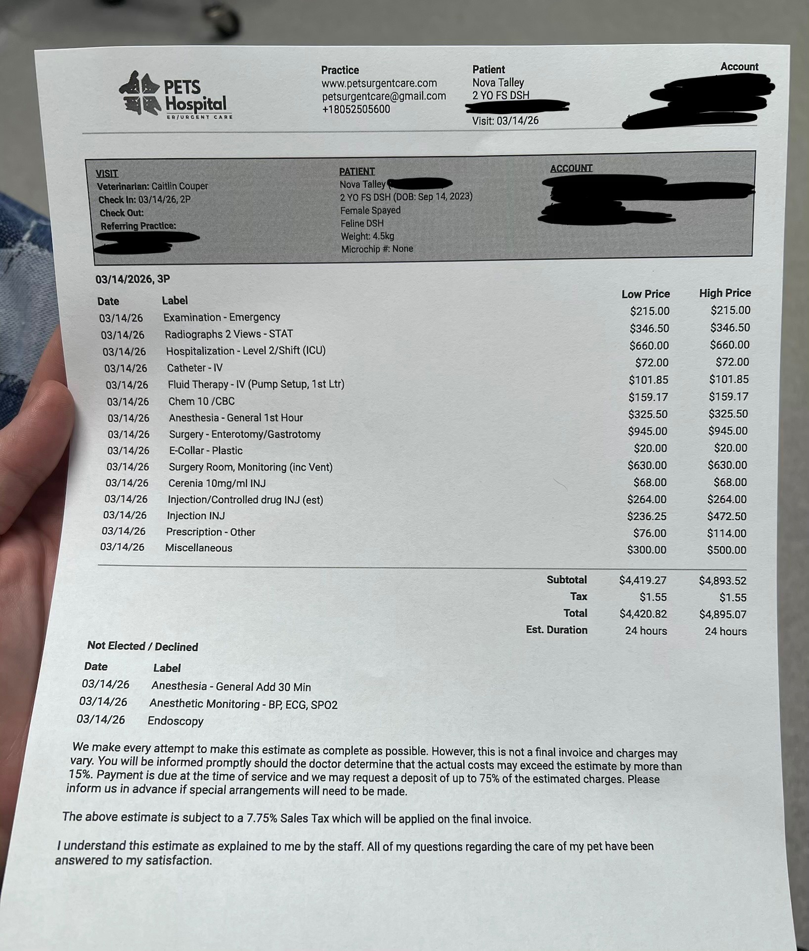 My partner and I are low income and share an apartment together with our four cats and one dog. We were dumped with a emergency vet visit bill that will be within $4,420.82 to $4,893.52 with a possibility of it increasing if they need to perform life-saving measures in case there’s problems during surgery.