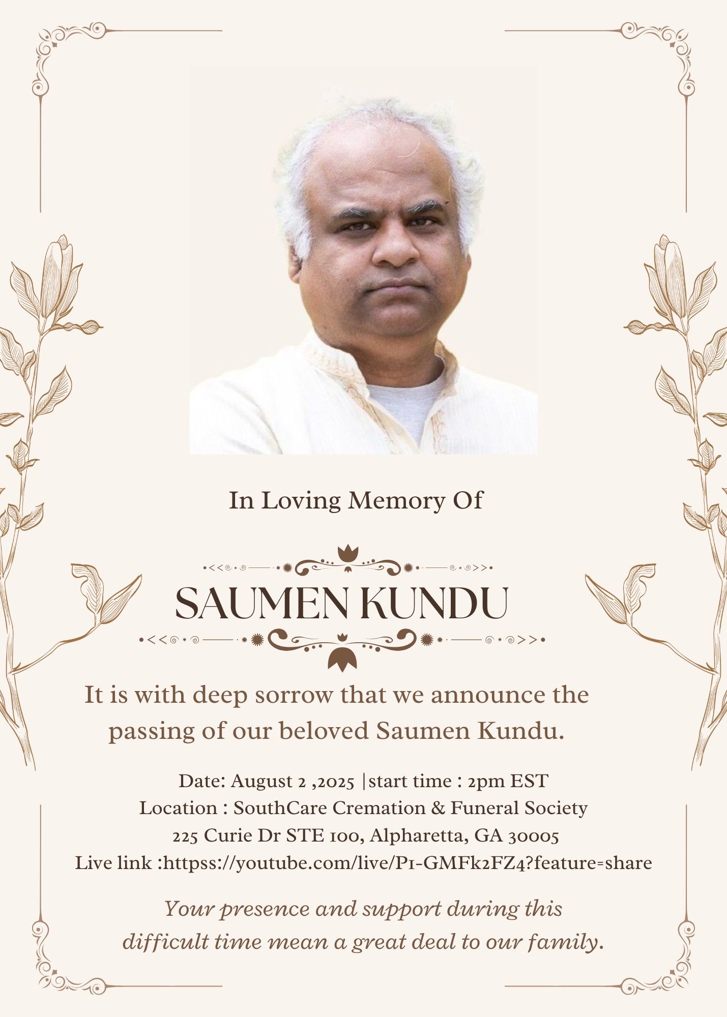 Mr. Saumen Kundu tragically passed away on July 24, 2025, at approximately 7:51 p.m. due to drowning at a beach in Sea Pines, Hilton Head Island. According to the Beaufort County Coroner’s Office, the Beaufort County Sheriff’s Office is the investigating agency.