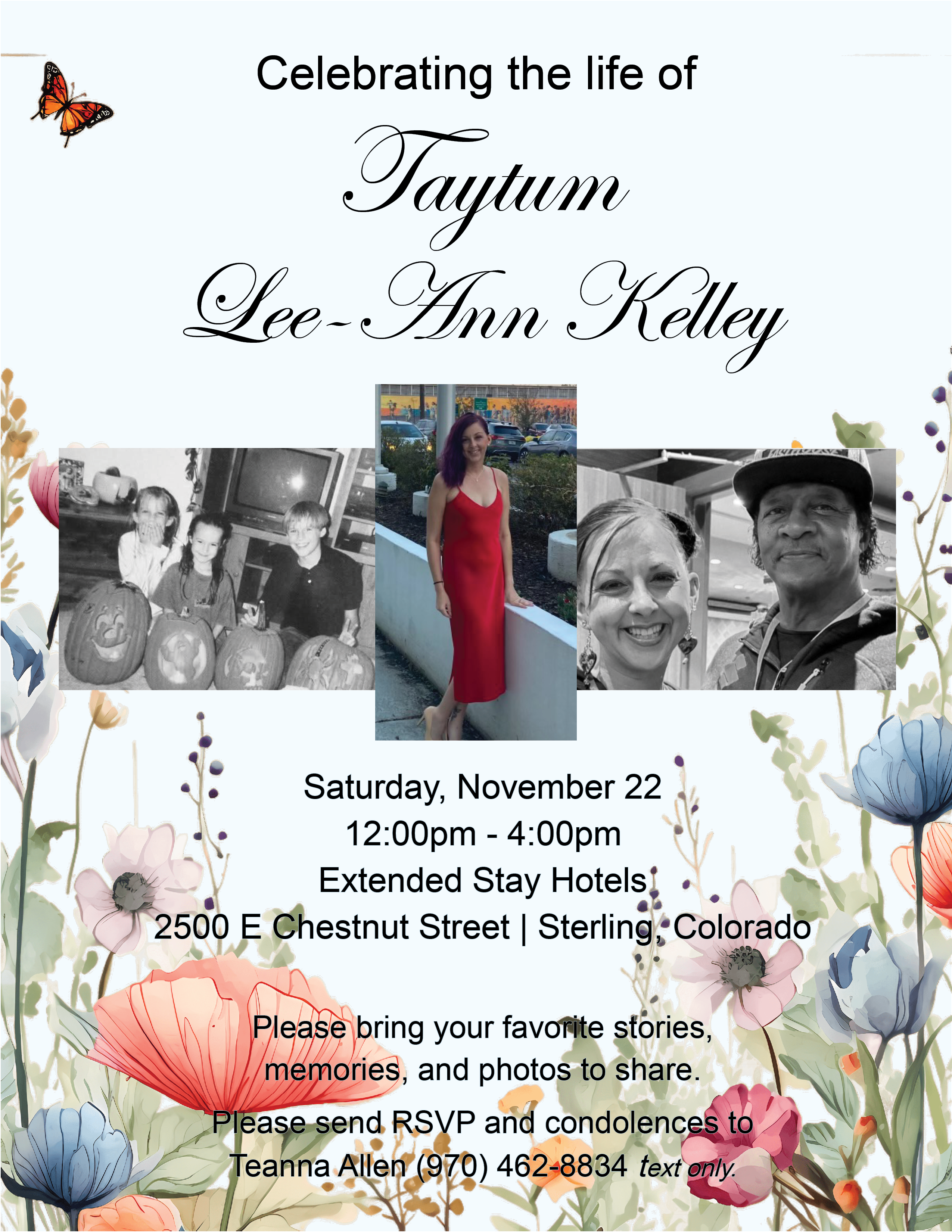Taytum Lee-Ann Kelley passed away November 16, 2025. She was such a spirited and spunky person. This GoFundMe is to help the family with their expenses for cremation and the Celebration of Life. Her service will be held Saturday, November 22. The family thanks you for your support, condolences, and donations. Any extra funds will be donated to a local charity.