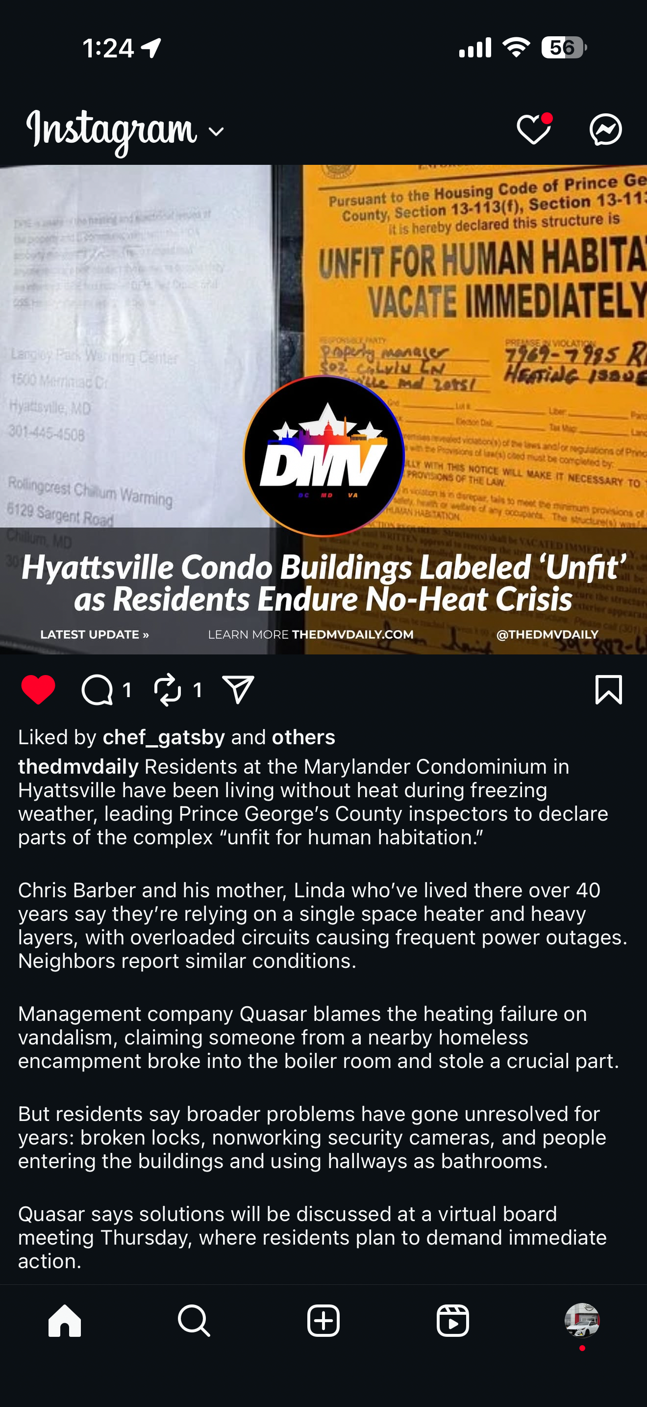 My name is Christopher Barber, and well before Thanksgiving, my mother, brother and I (Along with other residents) have been living without heat in our condo home at The Marylander in Hyattsville, Maryland. Despite paying regularly and now increased condo fees almost 100% double the regular condo fees, our heating system failed after someone from the homeless encampment broke in and stole a part from our community boiler room and it has not been fixed since.