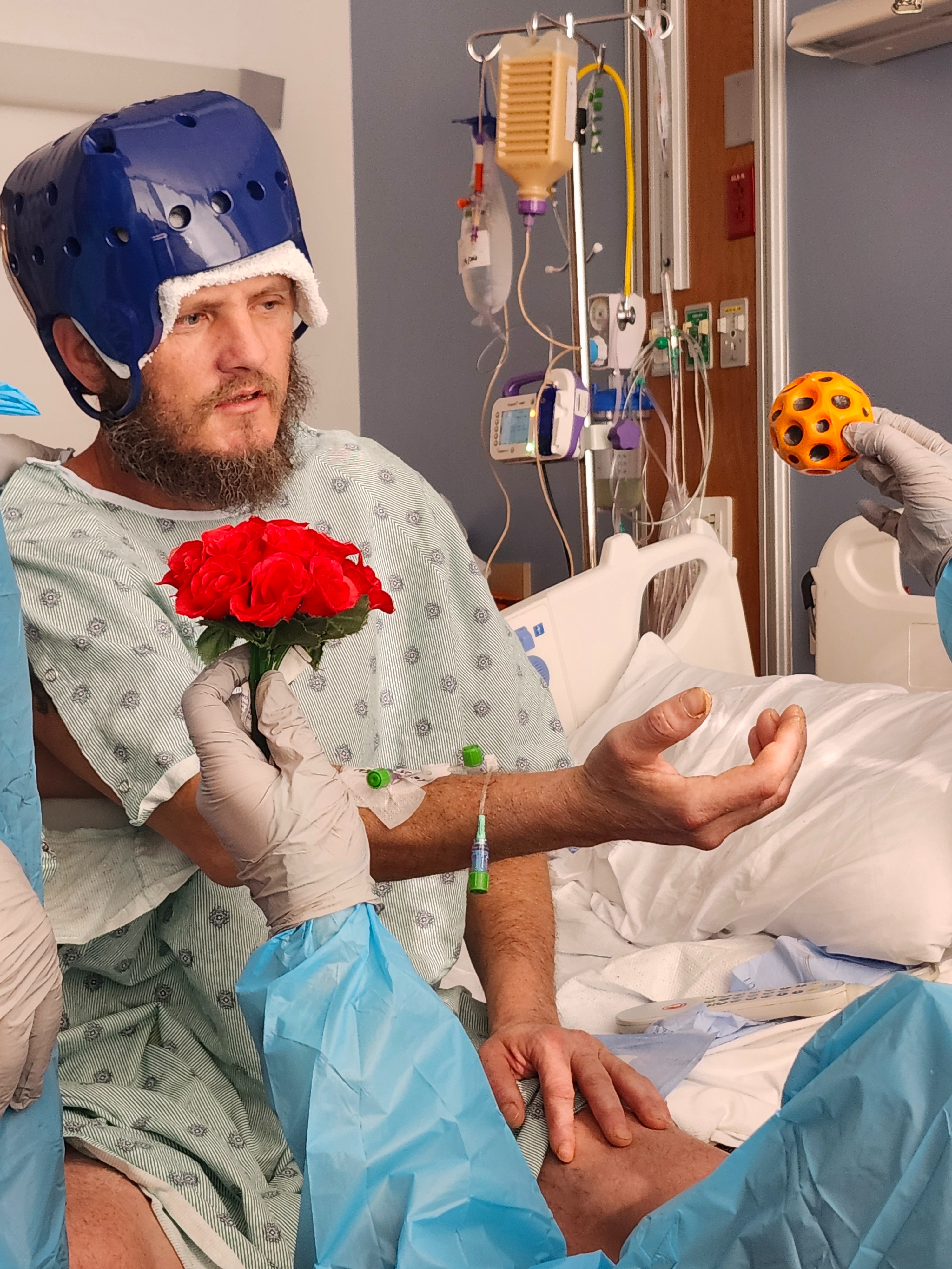 Two days ago made 5 weeks he has been in the hospital and he continues to improve everyday. Defying all odds, he continues to fight the awful mistake he made a little over a month ago. Once given a doomed prognosis, he can now stand & take steps (with assistance). He can throw and catch a ball, he can nod and shake his head, brush his teeth, give a thumbs up, and he recognizes us. His right side is still very weak but growing stronger each day. His speech still eludes him, but hopefully with time, and therapy, it will find its way back to him.
