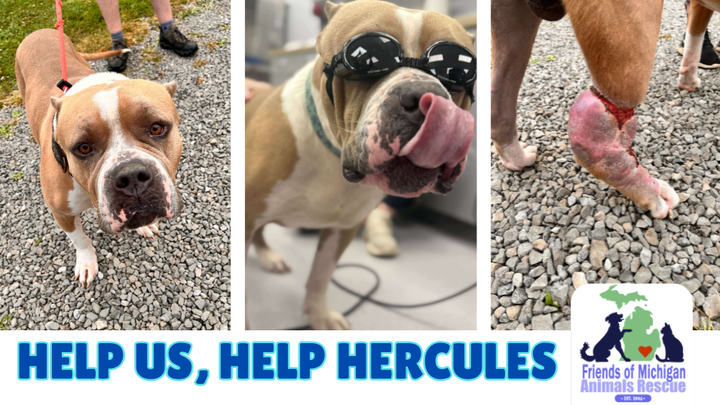When police became involved, the person watching him admitted they did not want to take responsibility for Hercules’ injuries or care. The original owner also said they did not want him back. That’s how Hercules came to us at FMAR (Friends of Michigan Animals Rescue).