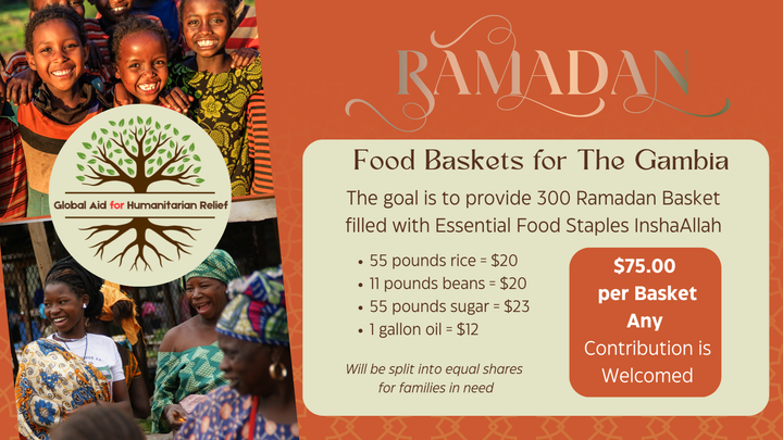 Global Aid for Humanitarian Relief is a Gambian based registered non-profit organization providing relief to low income, impoverished families in West Africa. Please support these efforts by contributing to our Ramadan Food Basket Campaign to support families in The Gambia during this blessed month of Ramadan InshaAllah.