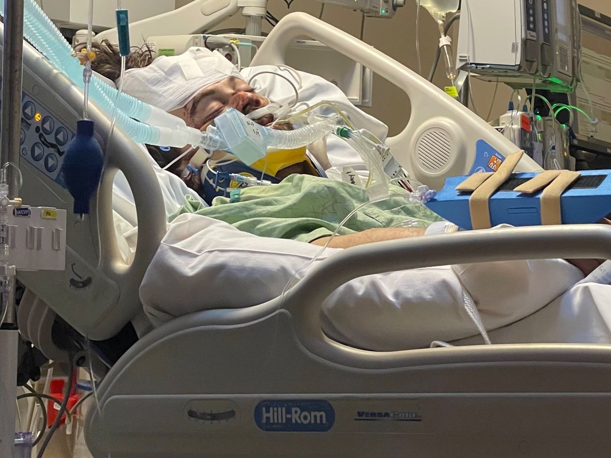 Extubating didn't happen yesterday, but hoping for today. They are planning another surgery on his leg today to put a rod in. He's responding to commands and knows we are here. They did a breathing trial to confirm that he is now able to breathe on his own. He's using his hands to do thumbs up and thumbs down and can shake his head. The swelling has gone down a lot, especially in his face.