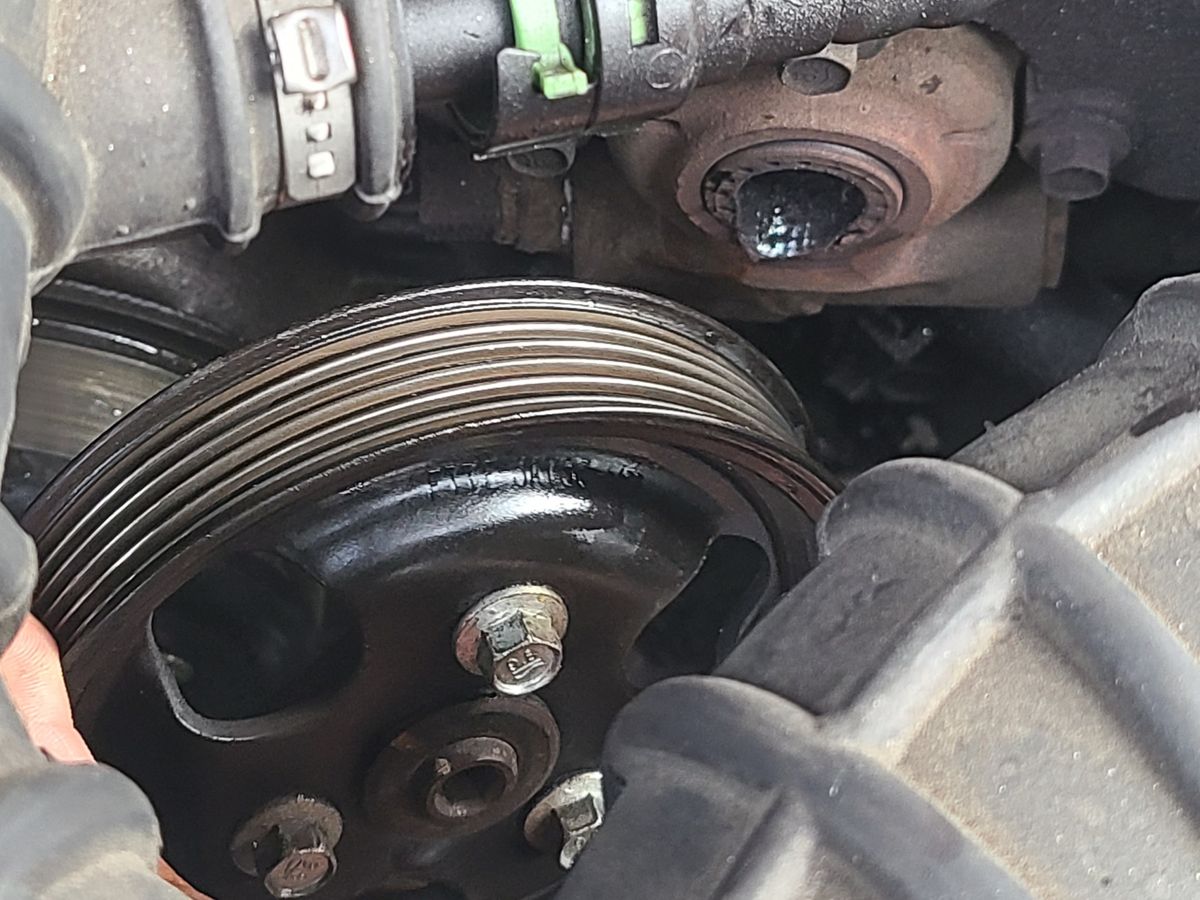 The serpentine belt split in the middle and melted off. The pulley got stripped of its threads. The tensioner needs replacing, and other related expenses include coolant and a radiator cap.
