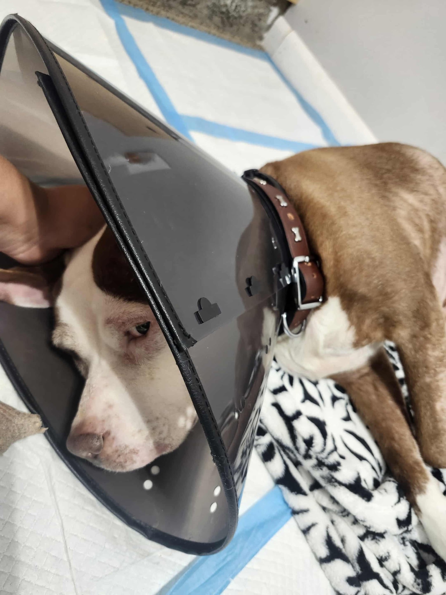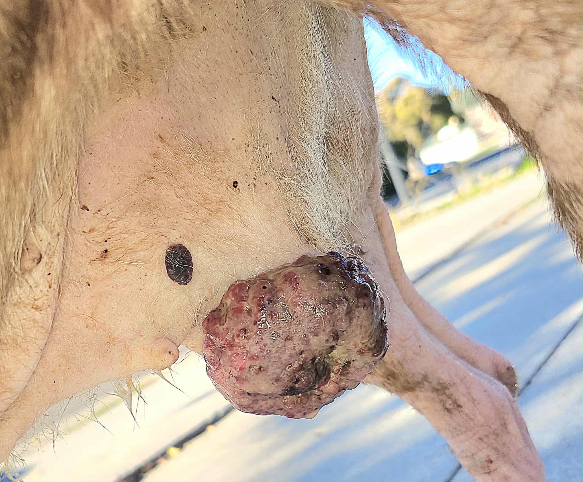 When we got her back, she was in rough shape — suffering from a severe flea infestation, a yeast infection, and now she’s been diagnosed with hemangiosarcoma, a type of cancer. She has a painful mass under her belly that needs to be surgically removed as soon as possible.