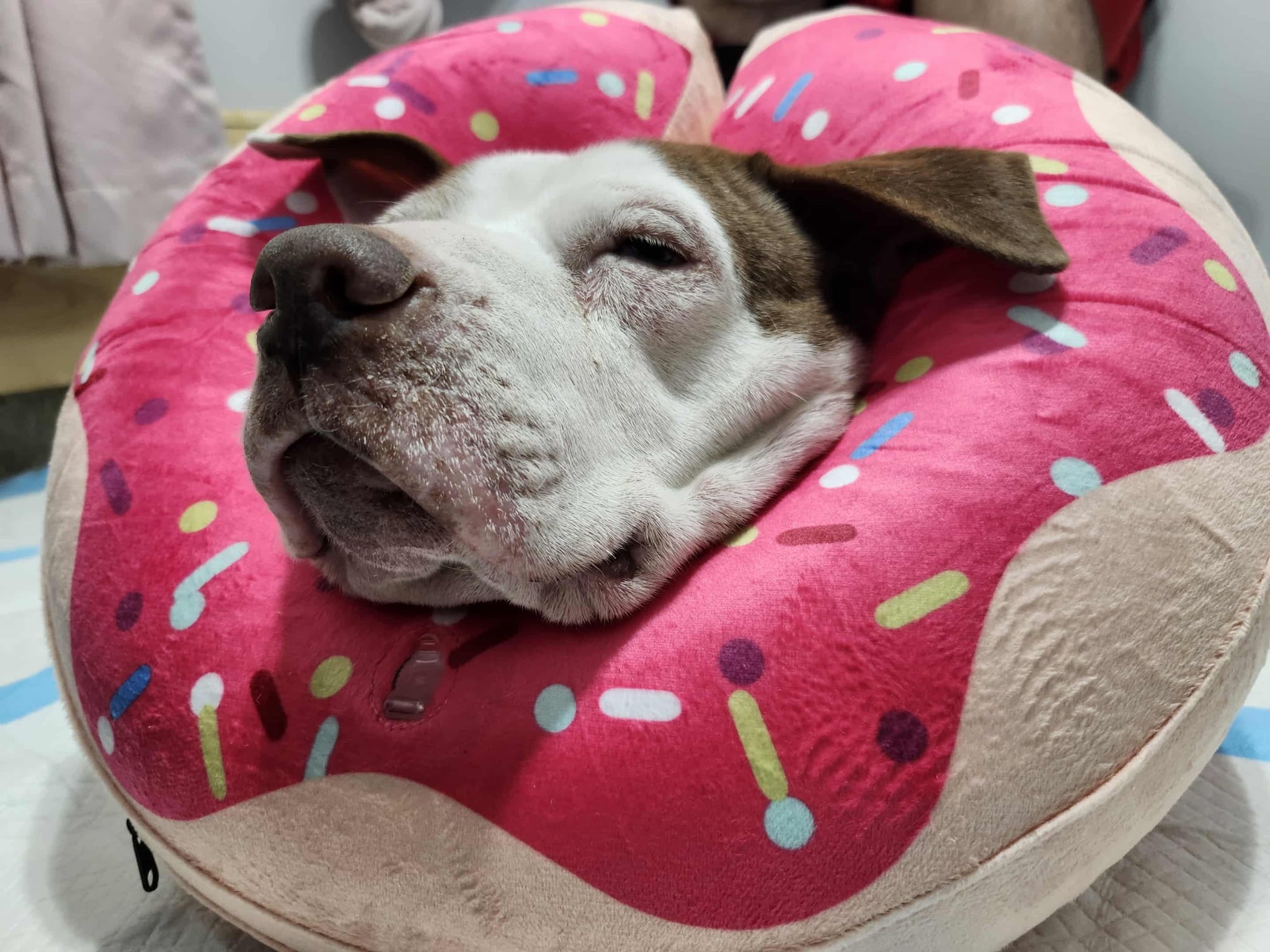 This is Gorda, our sweet red nose pitbull who has been part of our family for many years. For a while, Gorda was being cared for by a neighbor of my mom’s, but unfortunately, she was neglected during that time.