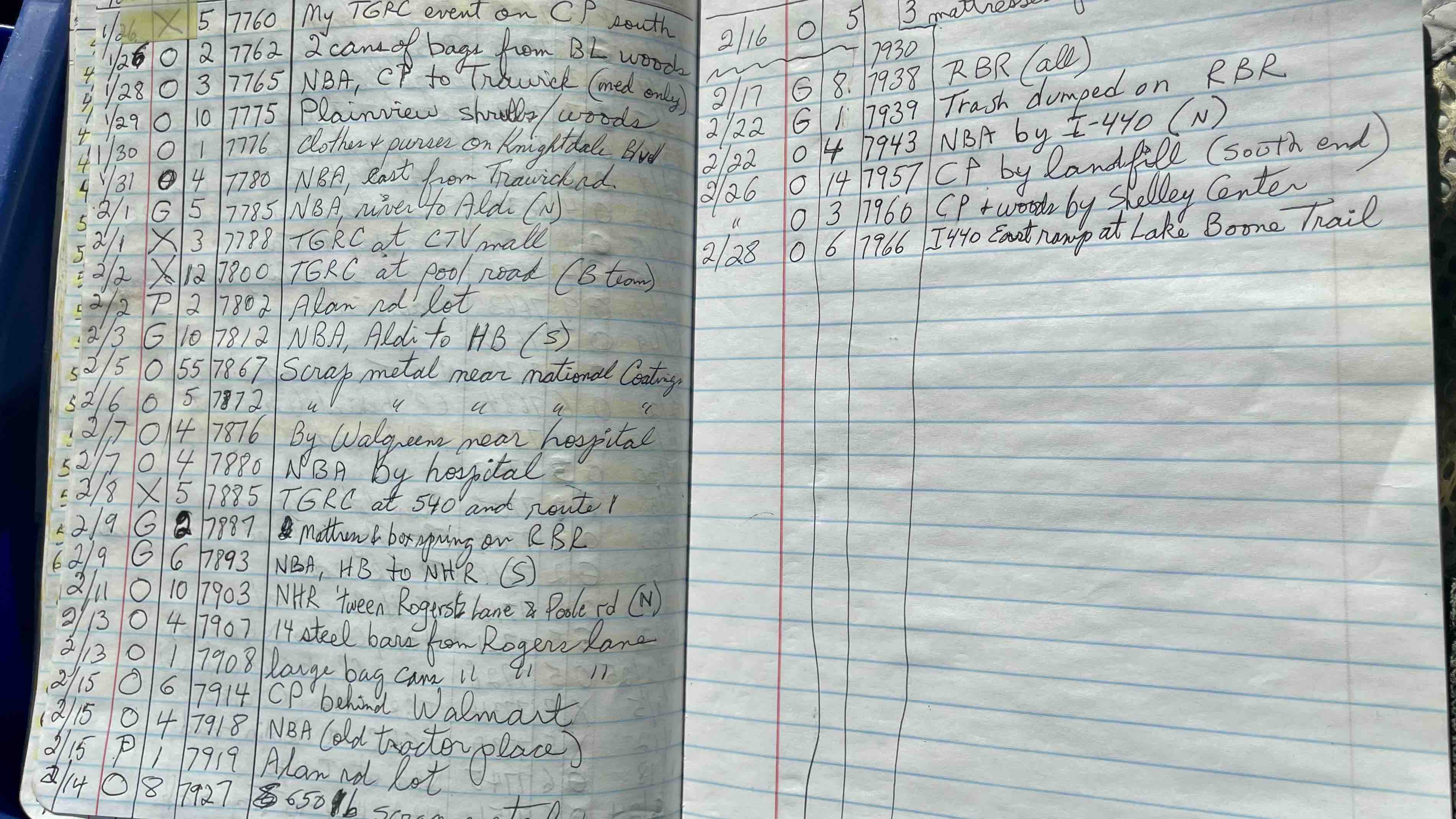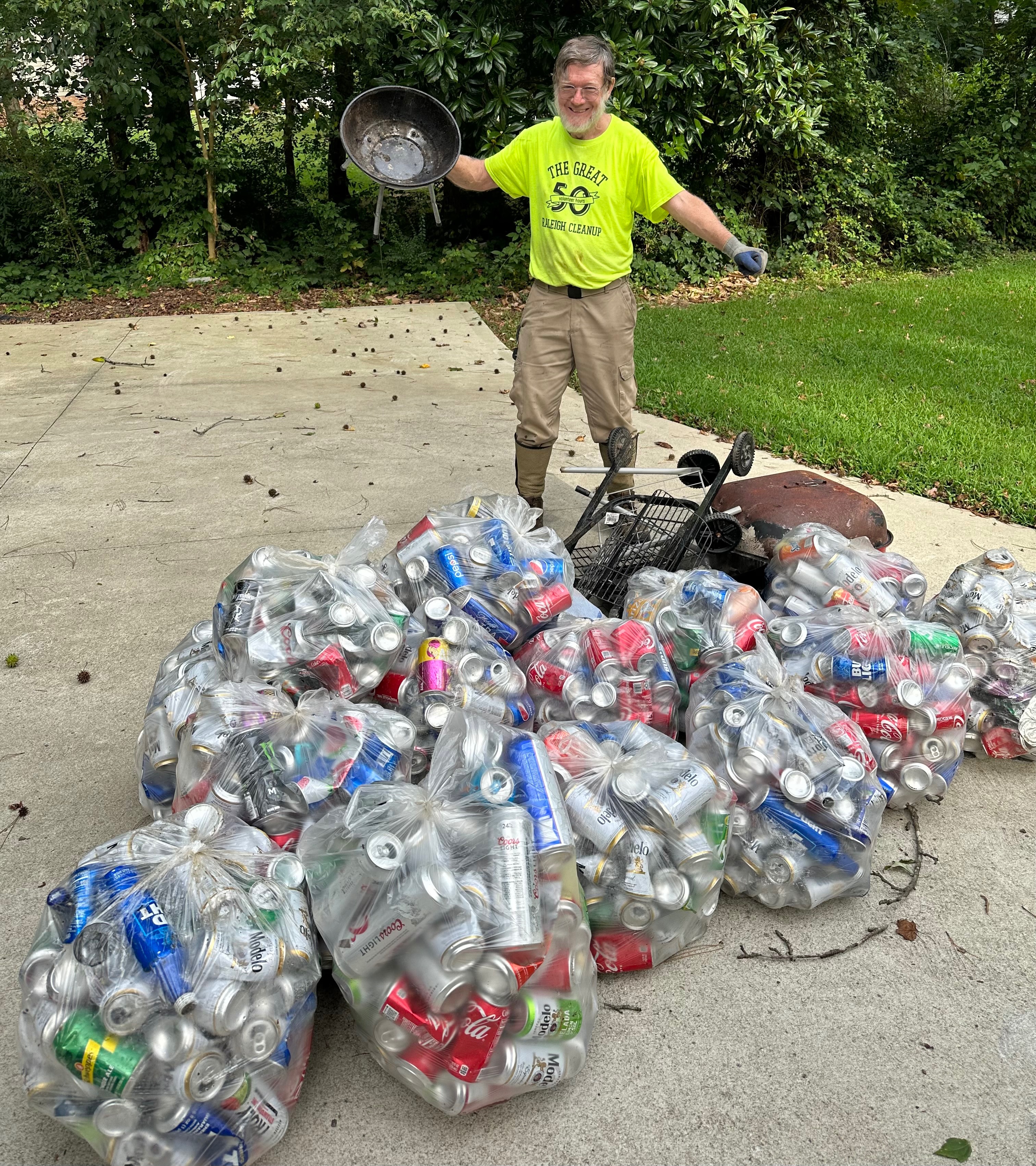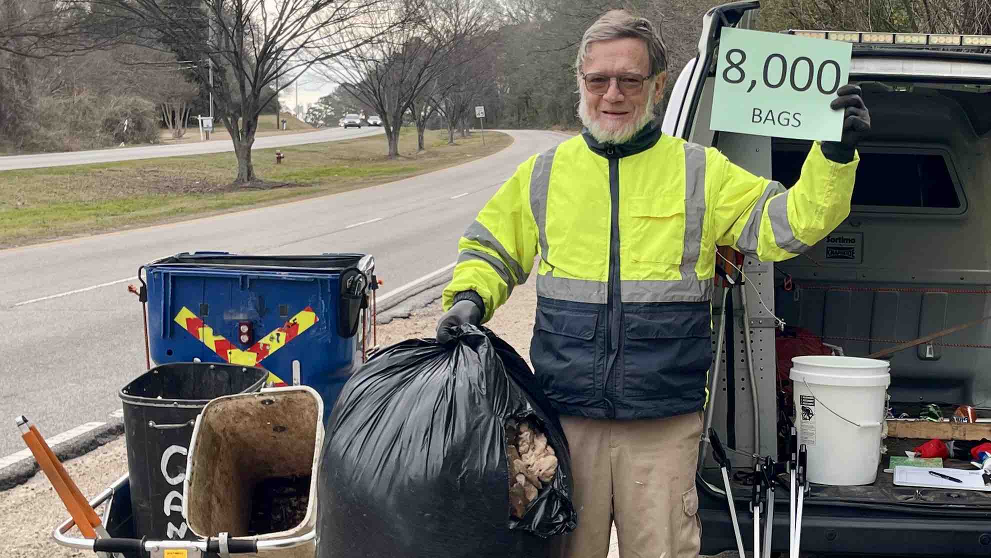 In January 2020, I stuffed a few plastic Walmart bags into my pockets and went out and picked some litter off my street. The next week I bought a pick up tool. I started doing it more and more often, switching soon to kitchen trash bags, then within a month to 50 gal bags and going out 3 times a week. I found a notebook on the street and started keeping a log. My hobby/obsession continued to grow. In 2022 (?), when my bag count was only at 2000, our local NBC station, WRAL did a 4 minute segment about me on the news. I've also received a certificate of appreciation from the NC DOT (dept of transportation ), a standing ovation from a joint session of the NC legislature here in Raleigh, and the Raleigh parks department's "Fred Fletcher" award (given for outstanding volunteer effort). If you google my name you should find plenty of stuff about me and my hobby.