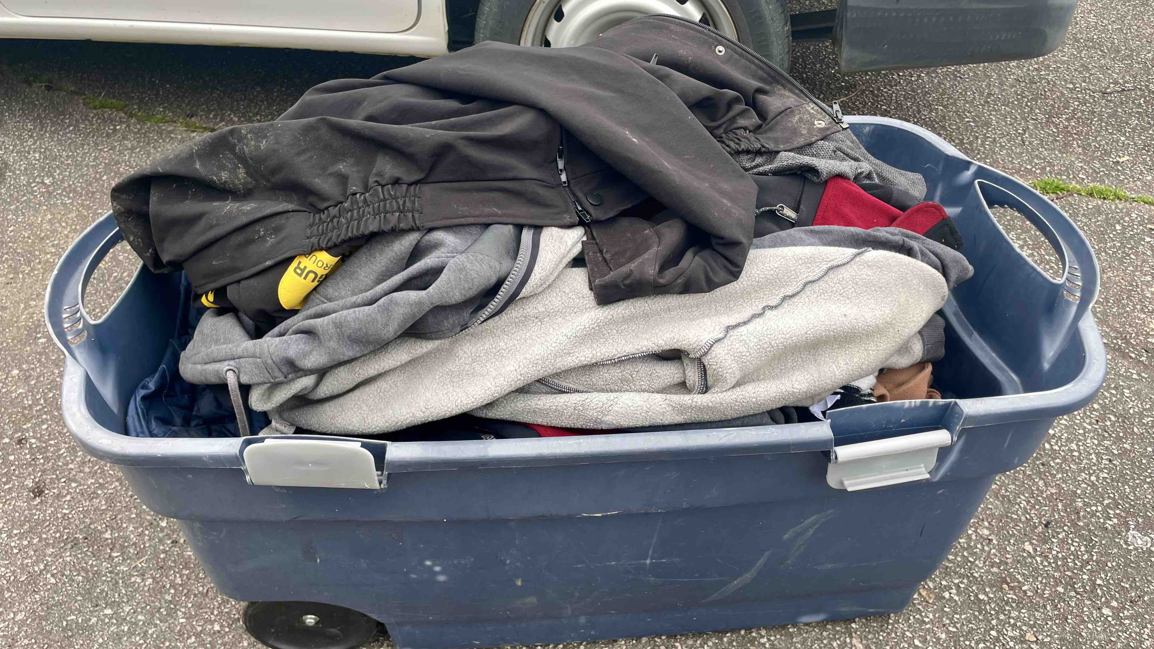 - money for laundry. I often clean out abandoned homeless sites (so, so many--it's sad). I take anything that's useable and either put it at my street corner with a "free" sign (always goes fast), or give it to a thrift shop. I find an enormous amount of clothing and blankets. After taking only the ones that have no holes, missing parts, broken zippers, and stains that probably won't come out, I take them home, wash them, and bring the good stuff to the thrift shop (warm coats and blankets I often give back directly to homeless). I average about 3 loads of laundry a week--a big truck load each year. It takes a lot of time to process all this laundry. And the water, electricity, detergent, and fabric softener costs add up to a very substantial amount. And once there was something in a pocket that gummed up the washer, causing an expensive repair. [True story: One day i came home with several bags of laundry. I left them in the garage for a few days. When I finally got around to washing them, I opened the door to my washing machine after a completed cycle, and ... out jumped a (very clean) surprisingly healthy and vigorous FROG! The darn thing had survived several days in a plastic bag, then an entire hot wash cycle, including a super fast spin cycle. -- When it jumped out it surprised the ____ out of me!!! :-) ]