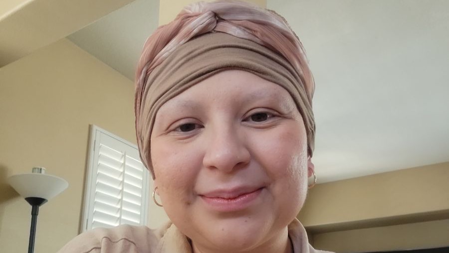 She wears a head scarf to wrap her beautiful bald head.