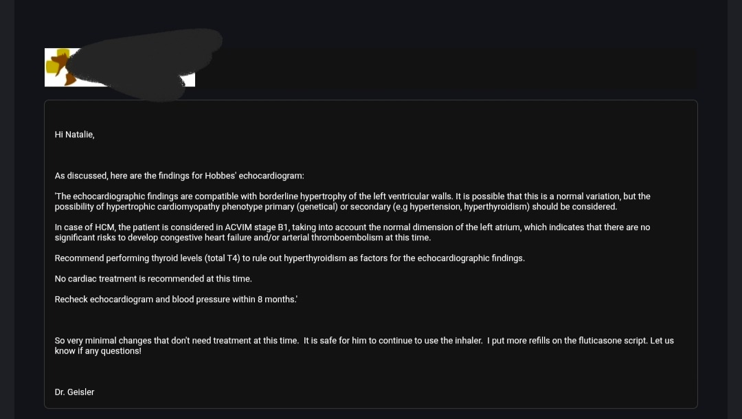 Hello, my name is Natalie. I have two lovely boy cats, Calvin and Hobbes, who are only 4 1/2 years old . Hobbes has recently been diagnosed with asthma and early-stage heart disease. This was discovered during a recent emergency visit that cost over $3k. I have brought up the fact that I thought he had asthma for years. The vets said that since it was so infrequent, not to worry. I kept pushing to start the work-up before it got worse. They informed me all the testing needed was expensive, so I started looking into pet insurance. I was going to pick a plan and then discuss testing at his next yearly visit. Before I was able to do that, he had a small coughing episode but then later on threw up. The next morning, I saw him spit up blood and rushed him to the emergency vet. After giving him oxygen, an inhaler, ultrasound, and X-rays, he was diagnosed with asthma and an enlarged heart. I took him a few weeks later for an echocardiogram to confirm heart disease or not, which was almost another $1k. He has stage B1 heart disease. He doesn't need medication, but he needs another test in 8 months with a cardiologist. On top of that, he uses an inhaler twice a day, which I have to get refilled every 2 months, plus his emergency inhaler. He is going to need a new set of X-rays as well. Now that he is diagnosed, they are preexisting conditions, so they will not be covered by insurance.