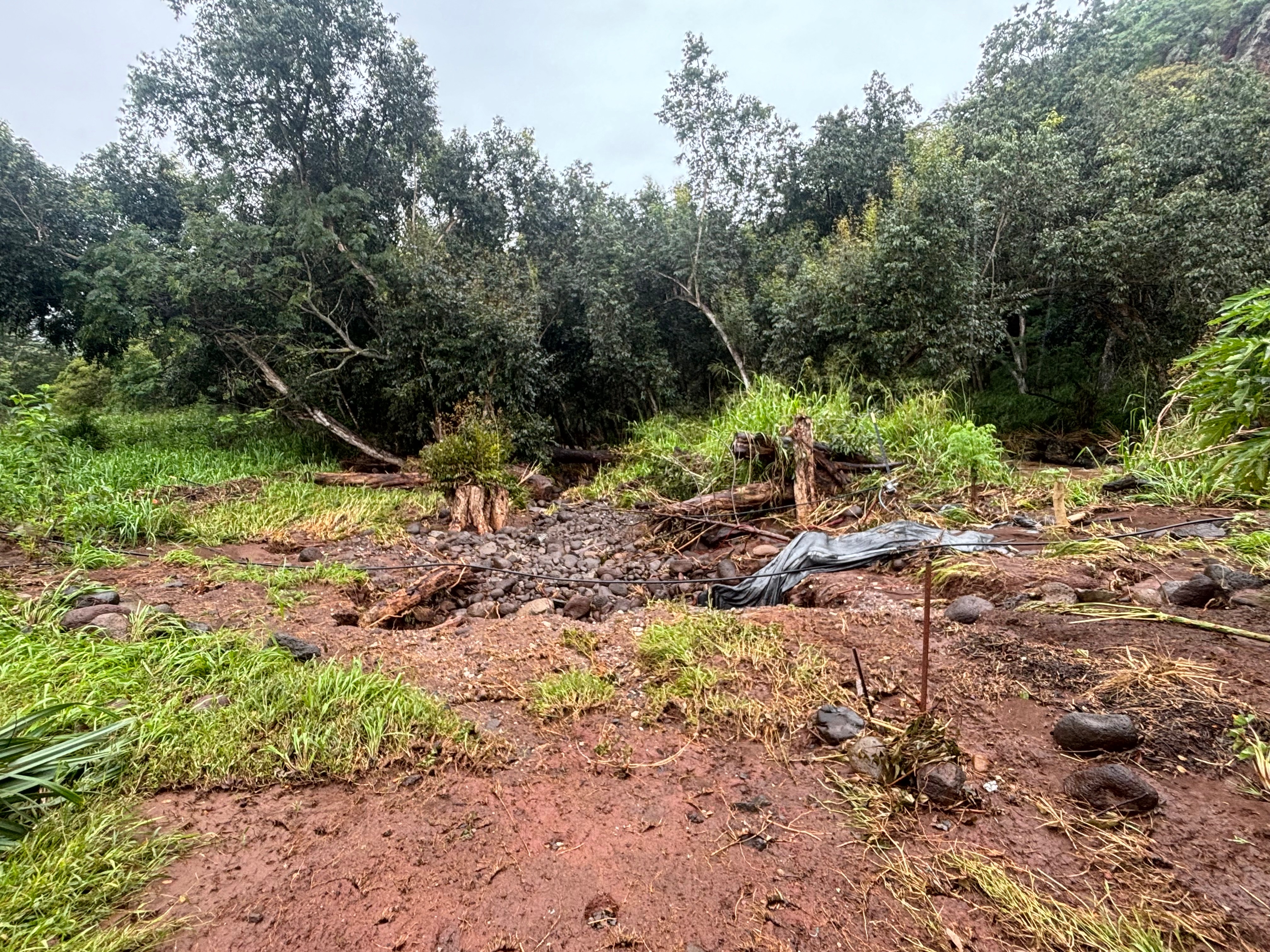 Located alongside the Kaukonahua Stream, the farm was recently hit by the recent storms on O‘ahu. The first storm caused flooding and damaged the crops and property. Before recovery could be completed, the second storm triggered landslides covering roads and native plants.