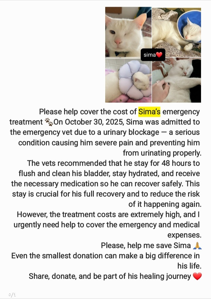 My beloved dog Jaco is suffering from severe kidney failure and needs long-term, intensive, and costly treatment to recover, while my cat Sima was admitted to the emergency vet due to a urinary blockage and needs close monitoring and urgent care.