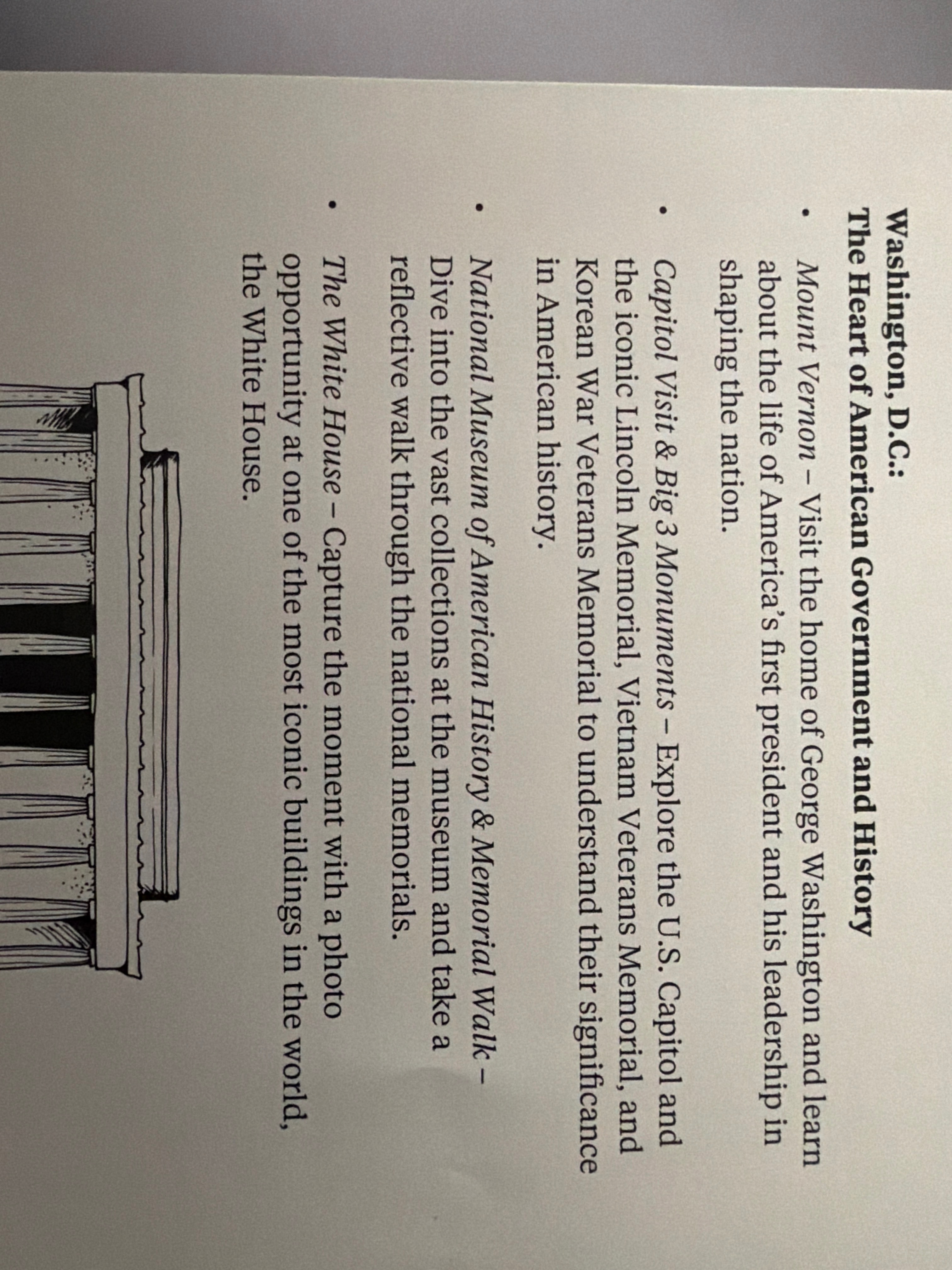 During this trip, I will have the opportunity to visit many historic landmarks, including the U.S Capitol, the Lincoln Memorial, the Vietnam Veterans Memorial, the Korean War Memorial, the White House, and more.
