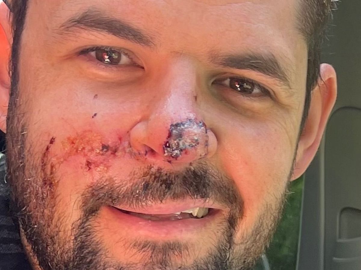 JEFF LAID FOR 2.5 HOURS AS THEY STITCHED HIS FACE UNDER LOCAL ANESTHETIC! A SHOT TO NUMB THEN ONE STITCH AT A TIME! This was the best way to repair the damage!