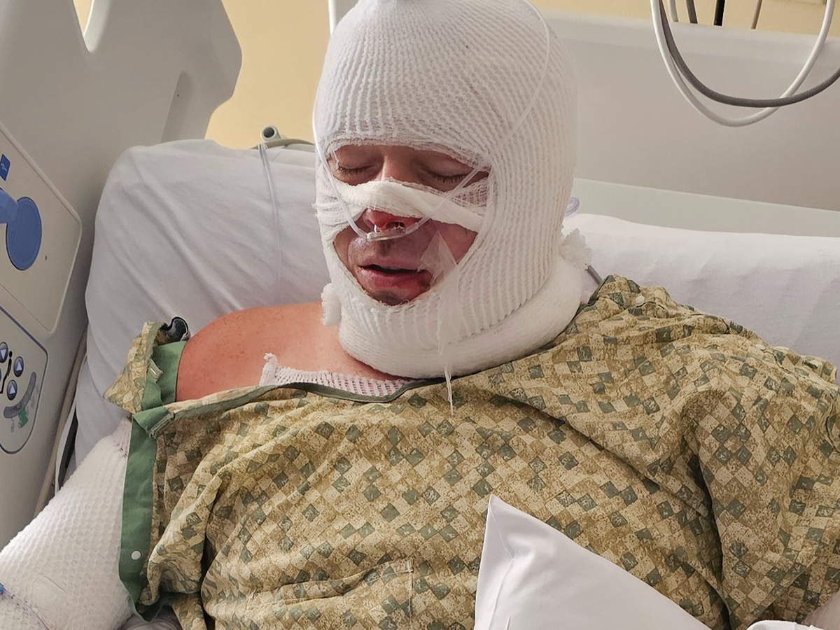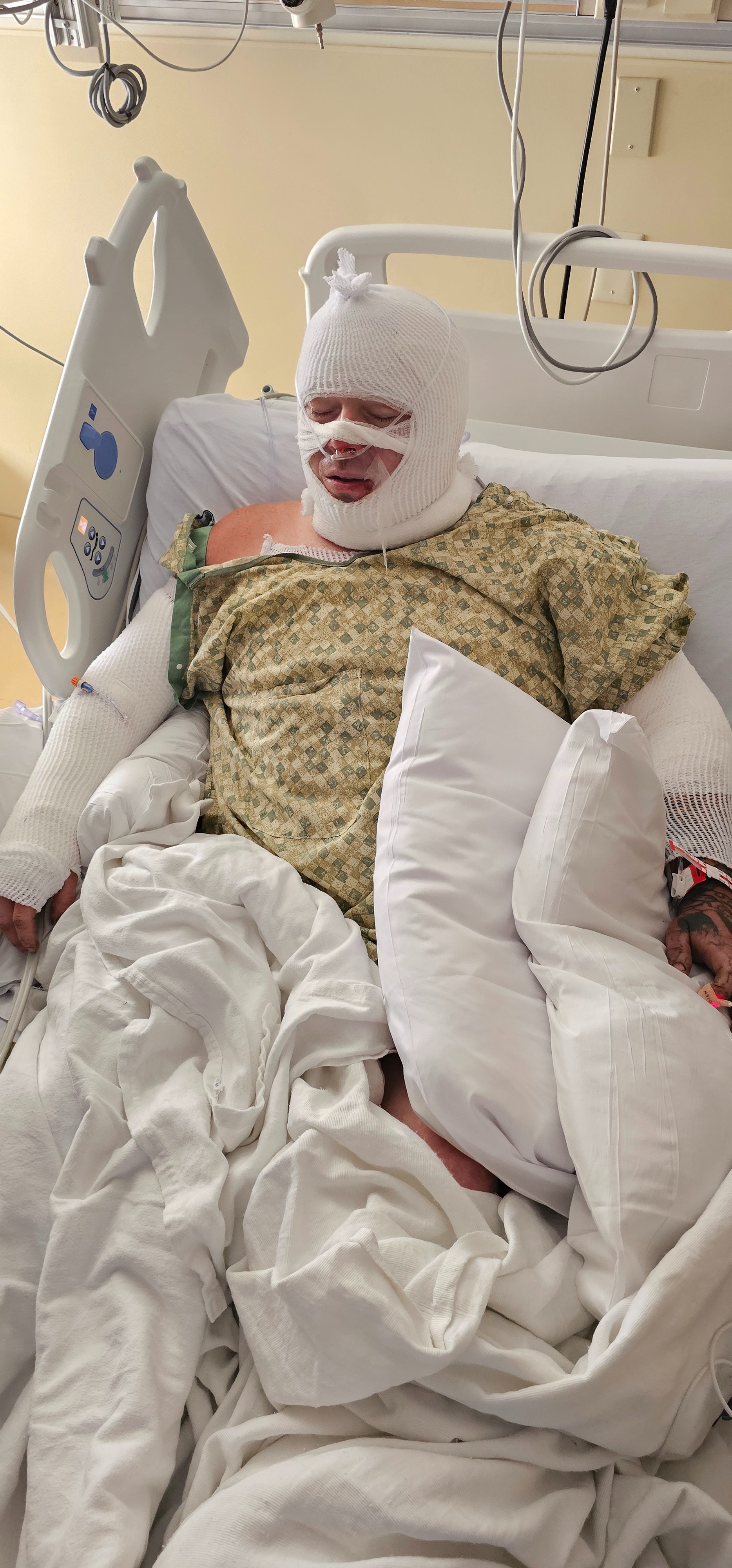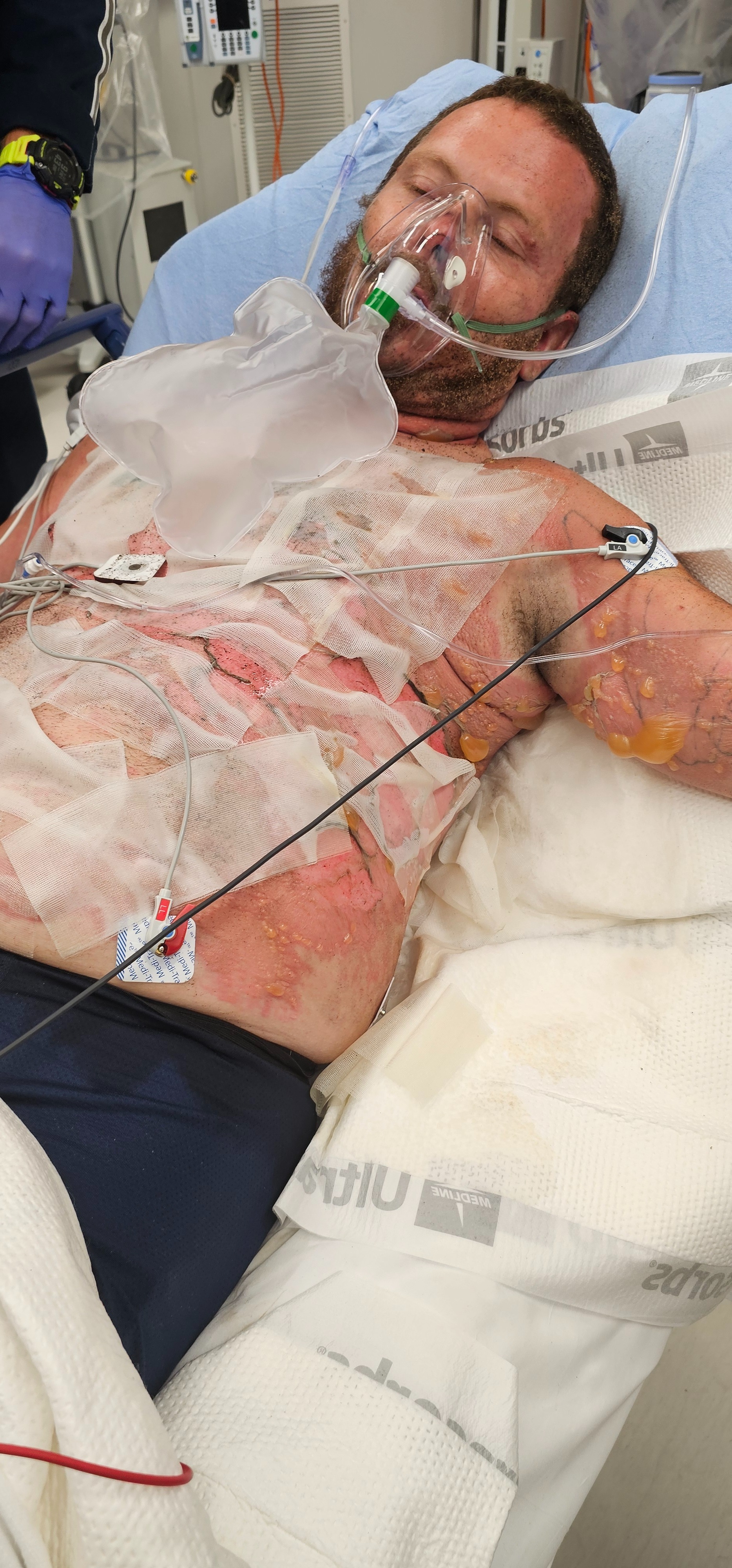 He was working on a dirt bike for one of our kids. The gas tank leaked without him noticing, and a spark from the battery ignited the bike, which then caught his body. He ended up with 3rd-degree burns on 13% of his body.
