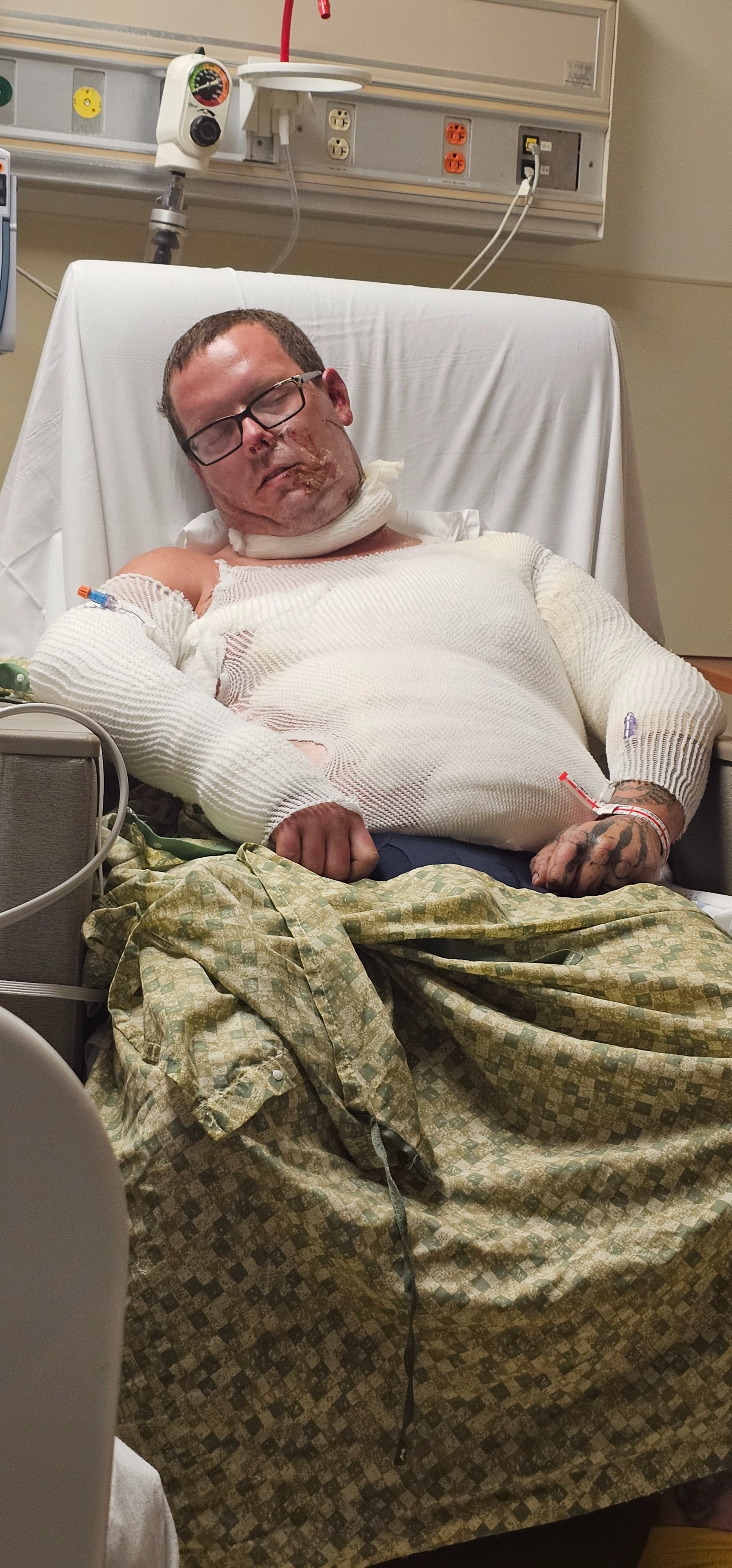 After getting to the ER, he was life-flighted to Doctors Hospital in Augusta, Georgia (about 4 hours away from home). He had to have skin grafts done on May 25th; that was a 4-hour surgery. Jeremy was discharged on May 27th. The night of discharge, we had to get a hotel room before we were able to get home. He had his first follow-up this Wednesday (June 4th). We thought we'd get lucky and get to be done at that point, but unfortunately, Jeremy still has most of his grafts on. They're scheduling another surgery and more grafting.
