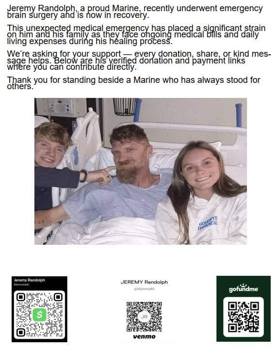 Im Jeremy Randolph the funds will be going to help with my medical and every day bills that have a cured after my brain surgery and for my next surgery to repair the nerves in my left hand that I lost use of after the first surgery so I can eventually get back to work
