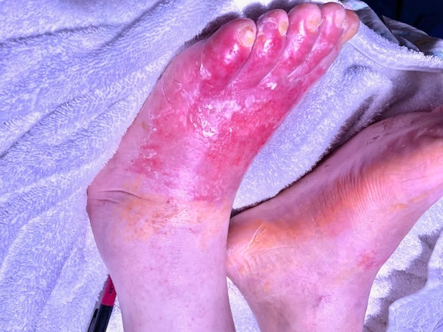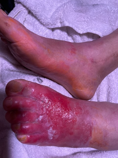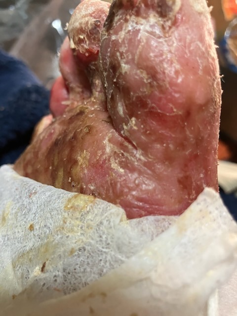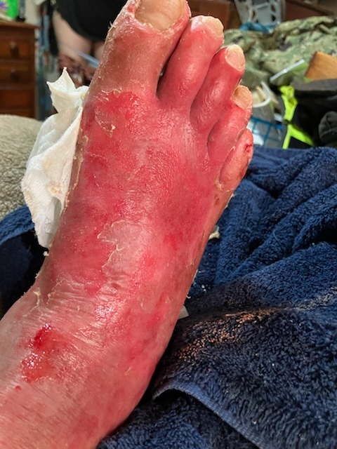 Until a year ago when he bought a pair of snake boots from a Goodwill store and ended up with a flesh-eating disease that has in one year caused him to spend over 127 days in ICU hospital care, to lose 52 pounds in weight, to lose 7 teeth, all his muscle mass, to not be able to put on a sock or shoes, to not be able to work. He's lost his home, he's $176,000.00 in debt to the hospitals, he lost his dream company, his ability to do anything. All he can do is lay in a bed and try to fight the excruciating pain of watching his skin fall off as fast as it gets to regrow.