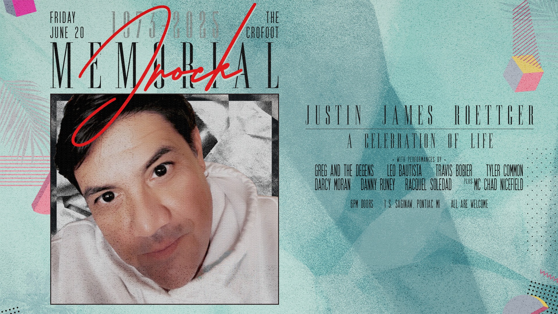 In the days ahead, we will find ways to honor Justin’s memory and the legacy of compassion and service he leaves behind. A Celebration of Life will be held on Friday, June 20, 2025 @ The Crofoot Ballroom. All are welcome at this memorial show in honor of JRock.