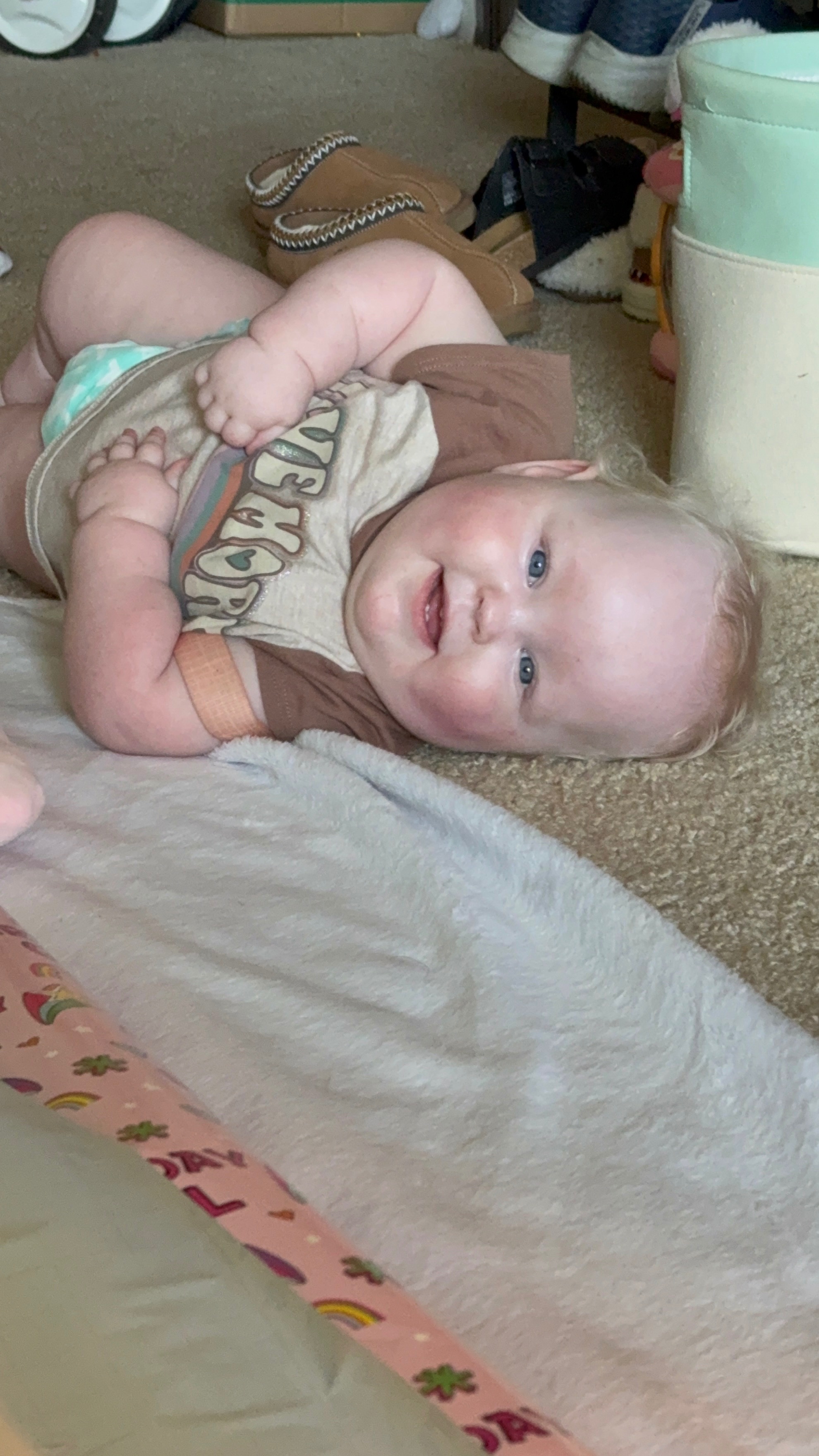 We also got confirmation on her genetic tests she had done. This was quite a process and happened by pure chance at a random appointment so we got lucky we found out early. She has a chromosome deletion (15) which is a rare disease called “Prader Willi”. It is a very confusing and complex disease that will follow her her entire life and there isn’t any cure. This disease gave us a lot of answers on her low muscle tone and eating struggles. Being a preemie born at only 27 weeks most of what she is doing is “normal” for a baby born 3 months early, however Junie does have very low muscle tone making it hard for her to hold her head or sit unassisted, but she can roll front to back snd bscl to front along with scooch herself across the flooe.!We have several appointments with genetic doctors and counselors in the next several months so it will be busy again.