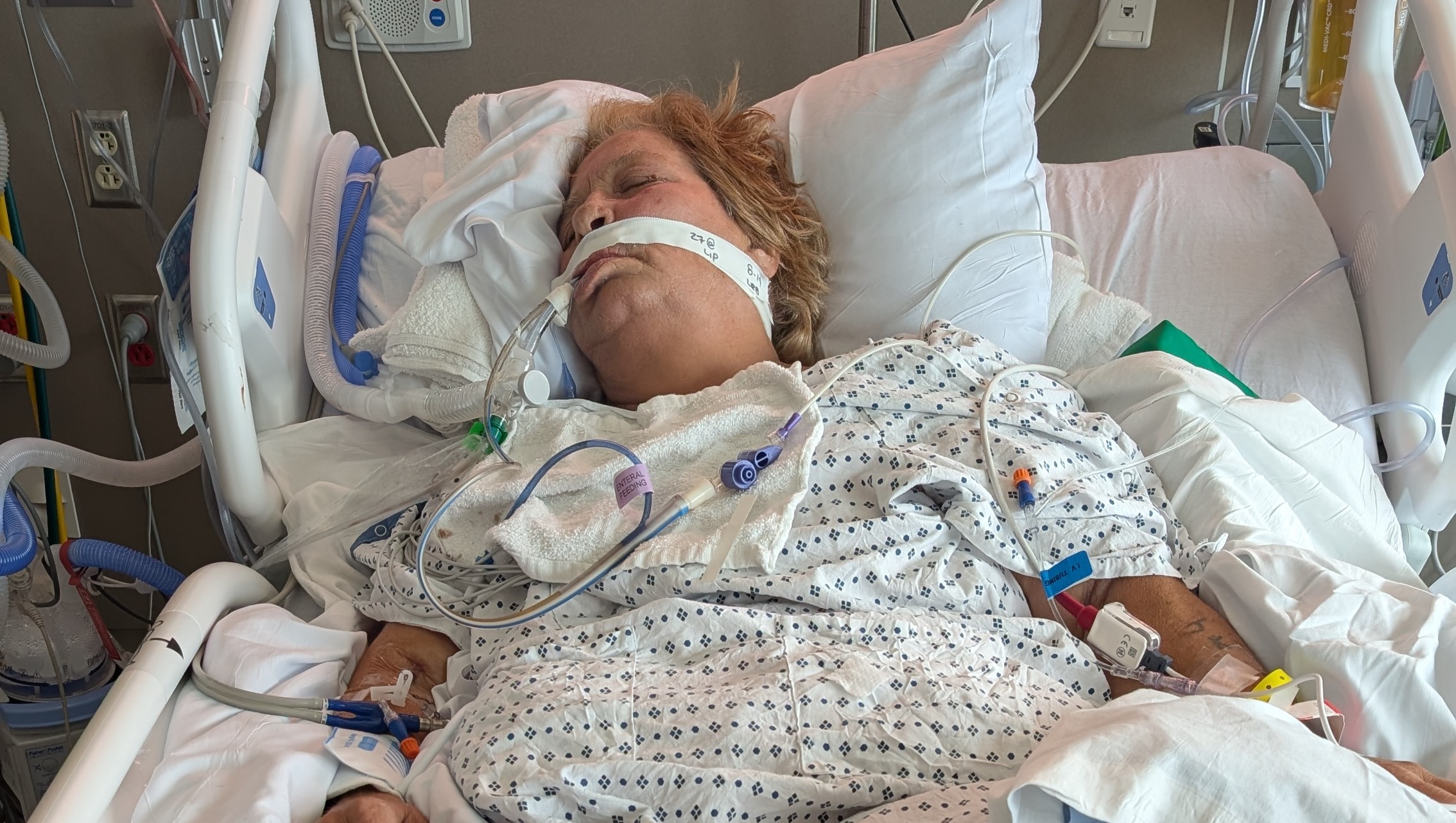 Karen Murphy went in on a Thursday, August 14th for a lung biopsy at Cape Fear Valley for a visit to inspect her lungs to see if she had developed cancer. The day before she was walking, talking and even driving and still smoking her cigarettes even though she shouldn't have. Shortly after receiving just two biopsies from her lungs, she started bleeding in her lungs and ended up having a heart attack that lasted 17 minutes before her heart started again. And while her heart may have started again. Her soul and presence was no longer there. She had also suffered minor brain damage and the results from the biopsy for her lungs came back positive as cancer. She has had to spend the last 8 days on a ventilator, a feeding tube and life support with medication to try to keep her alive including antibiotics and other pain reducing medications. Even though she was taking off sedation just 48 hours later, she appears to have not had the ability to come back even with no sedation.