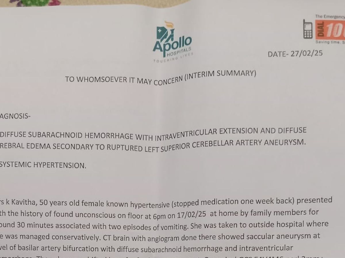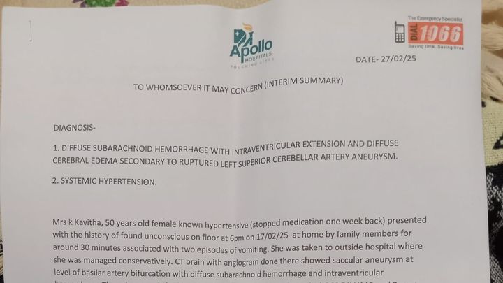 On February 17, 2025, Kavitha, my beloved aunt, was diagnosed with a brain hemorrhage/cerebral hemorrhage. She is a single mother. She lost her husband a few years back, and since then, she has been the only hope and support for her children. She always puts her happiness and well-being aside for the betterment of her children. She is currently admitted in the Intensive Care Unit at Apollo Emergency Hospital, Chennai, and she underwent endovascular coiling surgery for the hemorrhage. She is now further diagnosed with an aneurysm, and the calcium level in her blood is low, for which she needs to undergo dialysis. Her family has arranged money from their savings and loans so far for her treatment, and they would need more for further treatments. The cost of the treatment is overwhelming, and unfortunately, they don’t have any insurance coverage for her, and the ICU charge alone is costing them more. Doctors have confirmed that she has to be in the ICU for at least 15 more days to undergo the remaining surgery and monitoring. The family is struggling to arrange money for treatment and room charges. They are also not in a situation now to shift her to a different hospital as her condition is very critical and is not recommended by doctors.