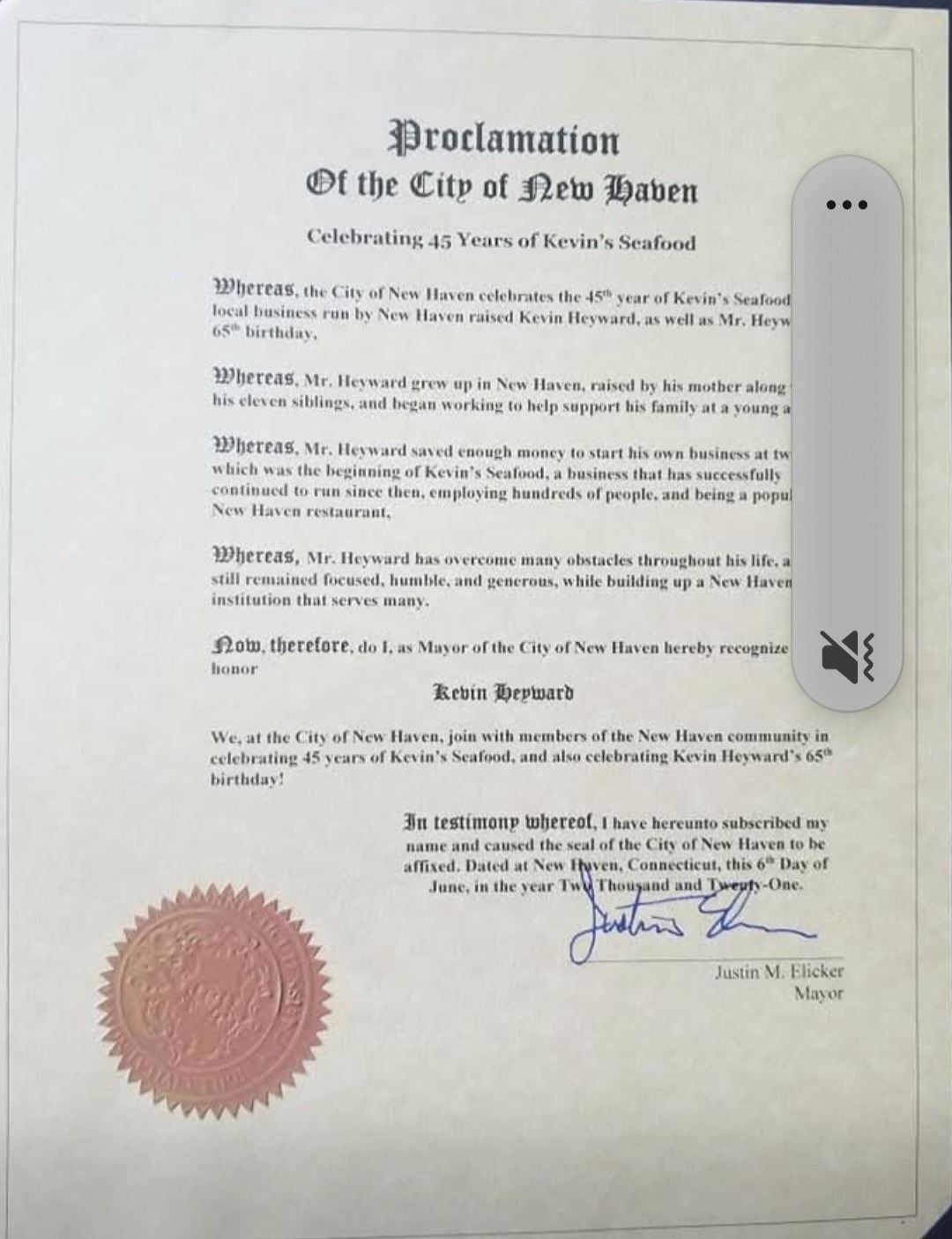 Throughout the years, Kevin's Seafood became a household name. Kevin knew all of the regulars' names and their orders without having to ask. Over time he collected a wall of treasured photos of family, friends and employees that greeted customers as they entered the restaurant. As the restaurant grew more successful, Kevin felt it was important to give back to those in need. For those who know Kevin, they realize that he is a kind, compassionate person with a spirit of generosity that has been evident since his early days. He has a long history of supporting local churches and schools, shelters, feeding the homeless, and has provided support funding local community events utilizing corporations and popular radio stations. In 2021, he received a Proclamation from the city of New Haven citing him for his service and support during his time in business.
