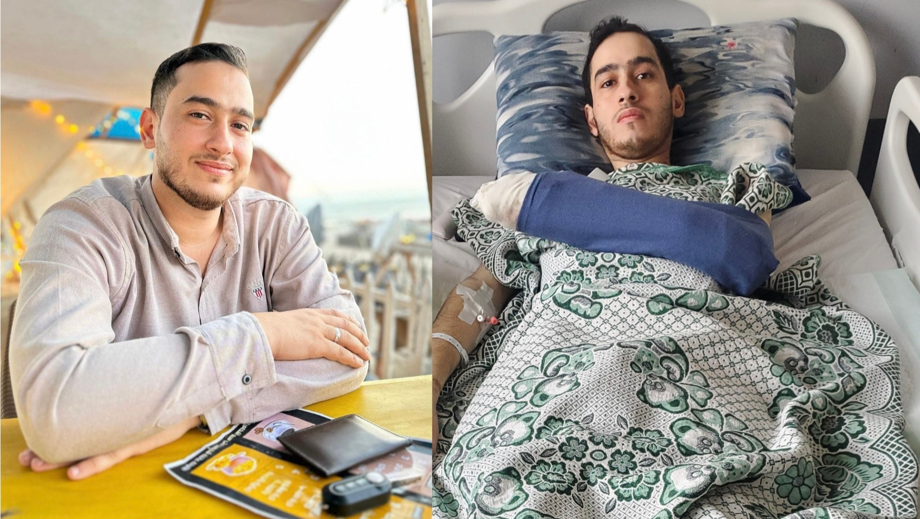 Khaled Jehad Shbair is a 28-year-old severely injured Palestinian who escaped Gaza. Khaled is suffering from fractures of his left femur bone, right tibia bone, three hand bones, and left middle finger.