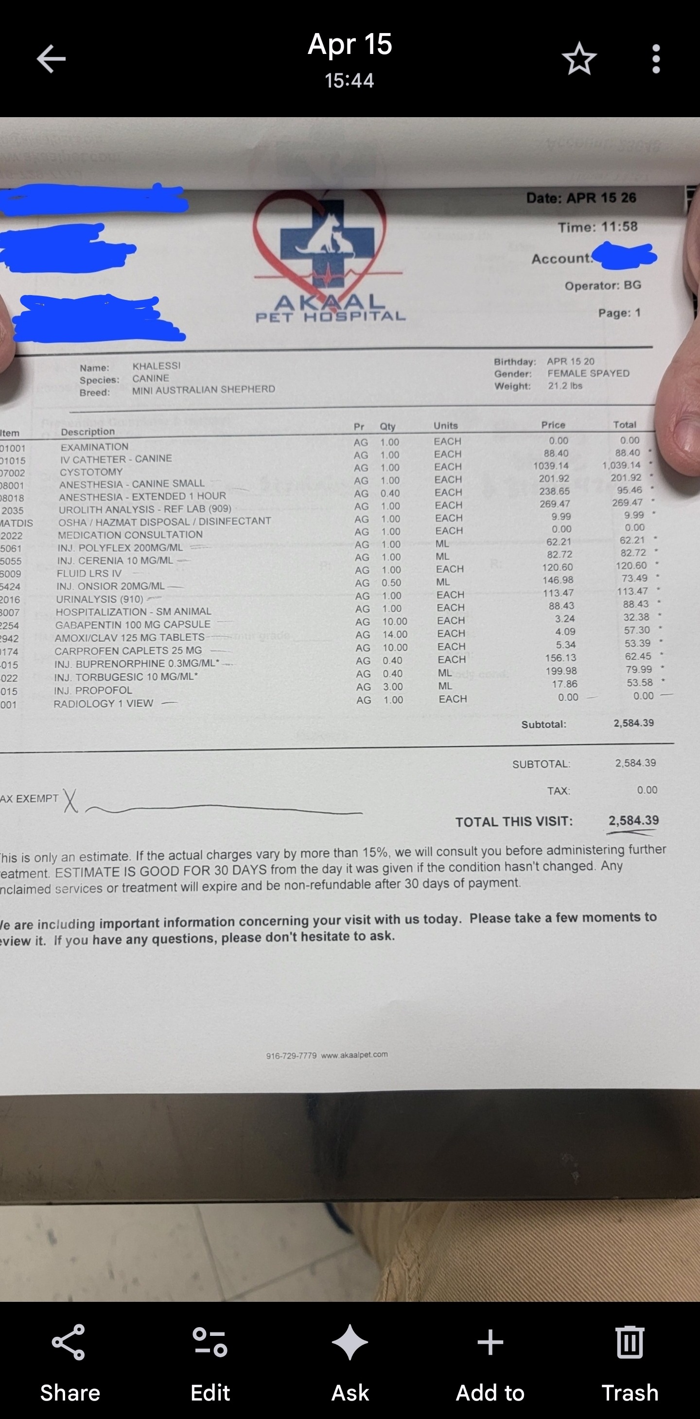My name is Sam and I'm trying to raise funds for a surgery (cystotomy) for Khaleesi. If you're unfamiliar, a cystotomy is removal of bladder stones that cannot be passed, broken up, or won't shrink in size from other treatments. For transparency, the cost for her surgery is $2,584 and I've spent approximately $1,500 for other treatments so far. If the surgery cannot be afforded, I don't even want to think about the last option. She is too dear to us, especially her dog sister, Stella, and that would ruin her if she had to be euthanized.