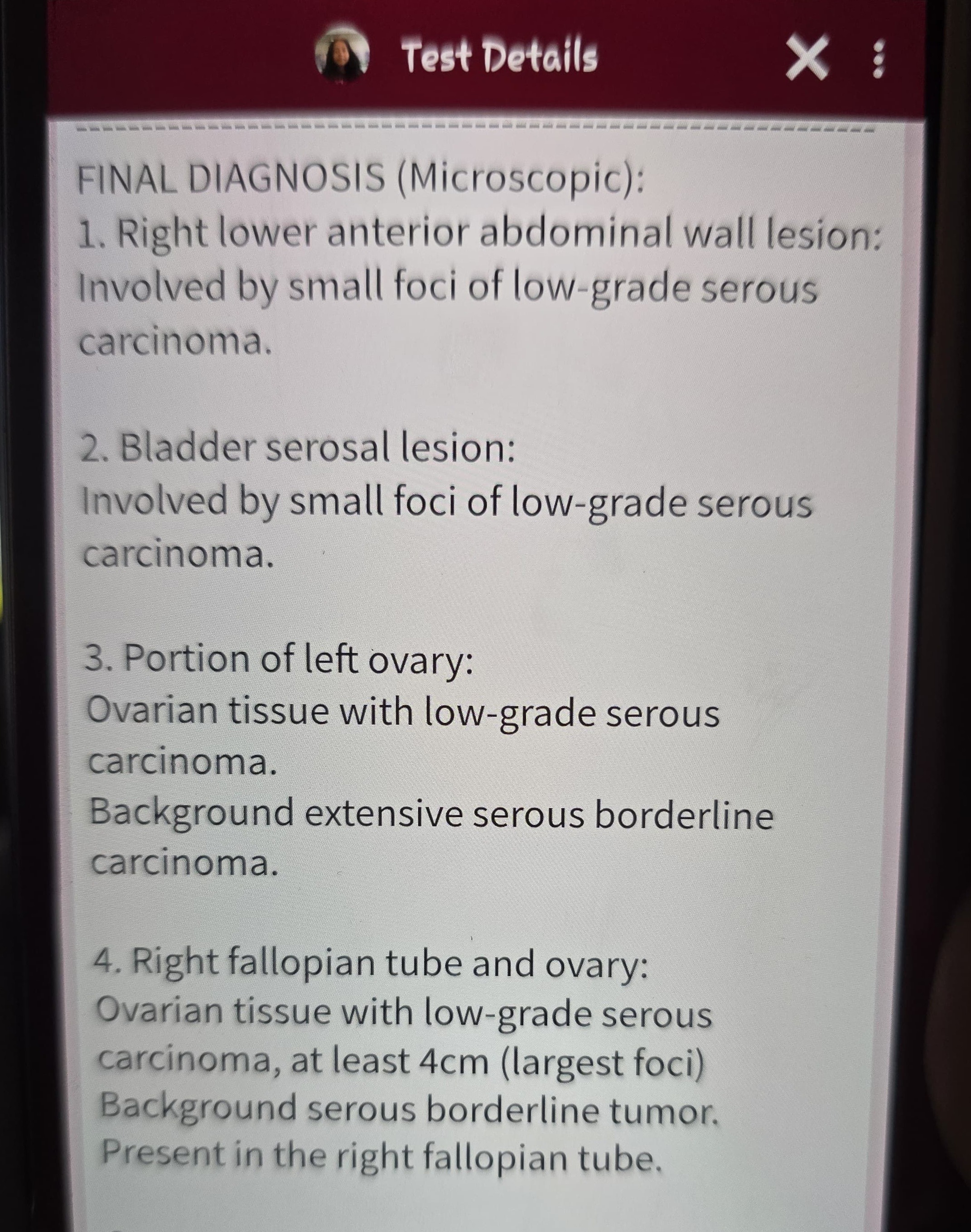 In April 2025, I went to the ER and found out I had an abnormal ovarian cyst. In September, I had surgery to remove my right ovary since the cyst grew and turned into a tumor the size of a lemon. The tumor took over my ovary and made the whole right ovary into a mass, leaving my uterus and my left ovary in risk. During surgery, my surgeon noticed abnormal masses on top of my left ovary, bladder lining, and abdominal wall. He took biopsies of those.