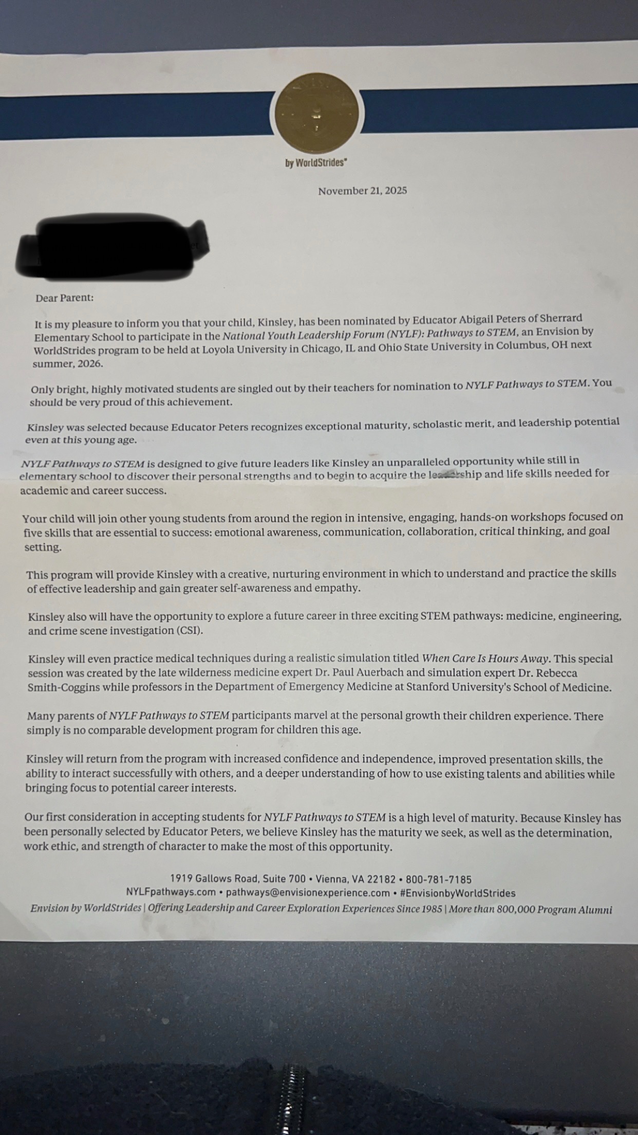 Kinsley has been nominated to attend the summer 2026 National Youth Leadership Forum: Pathways to Success at Loyola University in Chicago, IL. This nomination is a huge deal and something that will impact her long term, a “once in a lifetime opportunity” if you will. We are beyond proud of Kinsley for her dedication and commitment to working hard and being the best she can be in school, and we would love nothing more than to be able to give her this opportunity.